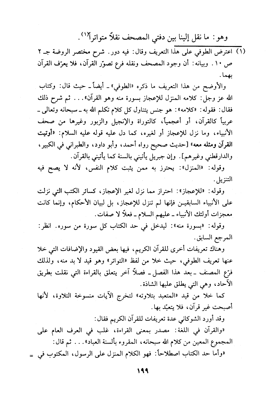 1 اعترض الطوفي علي هذا التعريف وقال: فيه دور. شرح مختصر الروضة جـ2 ص10. وبيانه: أن وجود المصحف ونقله فرع تصوّر القرآن، فلا يعرّف القرآن بهما.