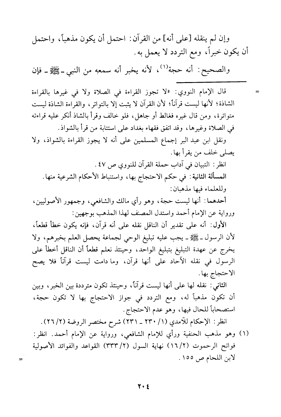 = قال الإمام النووي: "لا تجوز القراءة في الصلاة ولا في غيرها بالقراءة الشاذة، لأنها ليست قرآنا؛ لأن القرآن لا يثبت إلا بالتواتر، والقراءة الشاذة ليست متواترة، ومن قال غيره فغالط أو جاهل، فلو خالف وقرأ بالشاذ أنكر عليه قراءته في الصلاة وغيرها، وقد اتفق فقهاء بغداد على استتابة من قرأ بالشواذ.