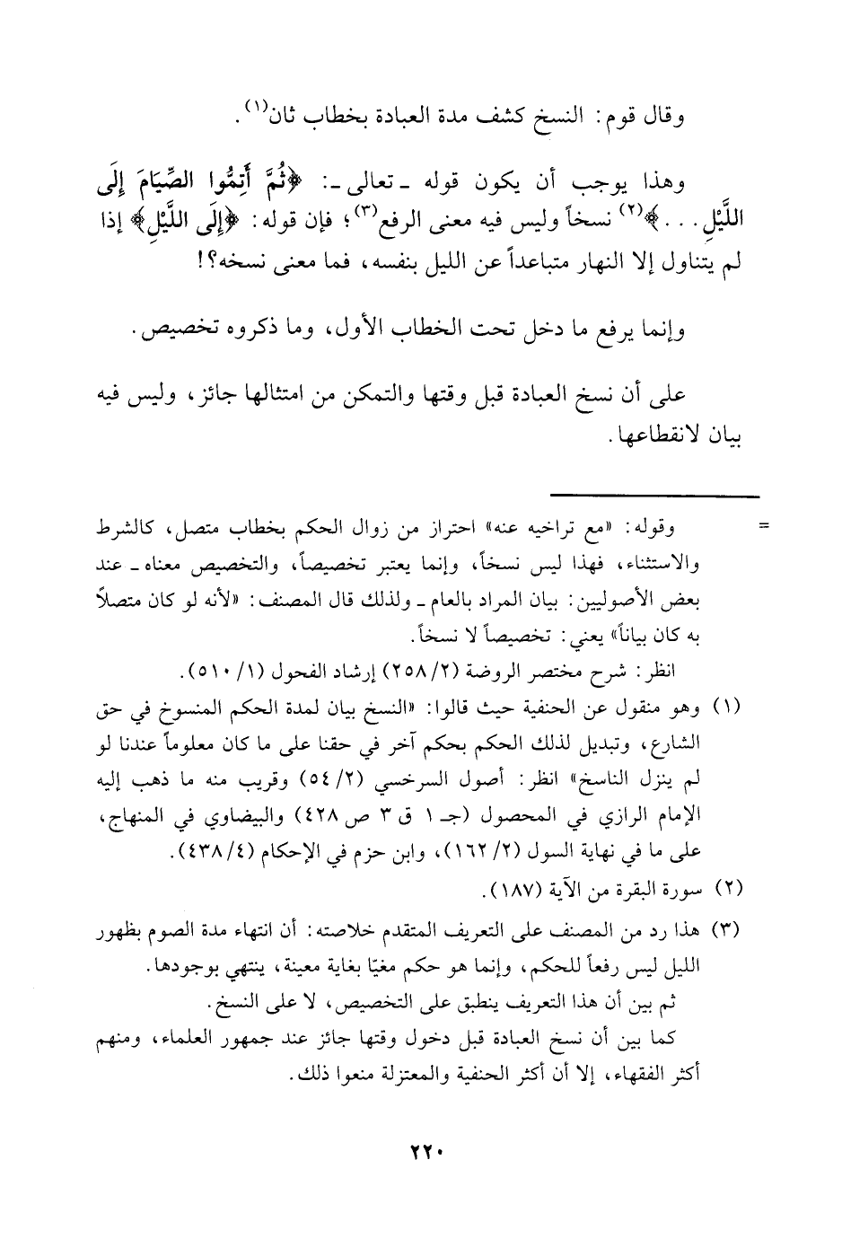 3 هذا رد من المصنف على التعريف خلاصته: أن انتهاء مدة الصوم بظهور الليل ليس رفعًا للحكم، وإنما هو مغيًّا بغاية معينة، ينتهي بوجودها.