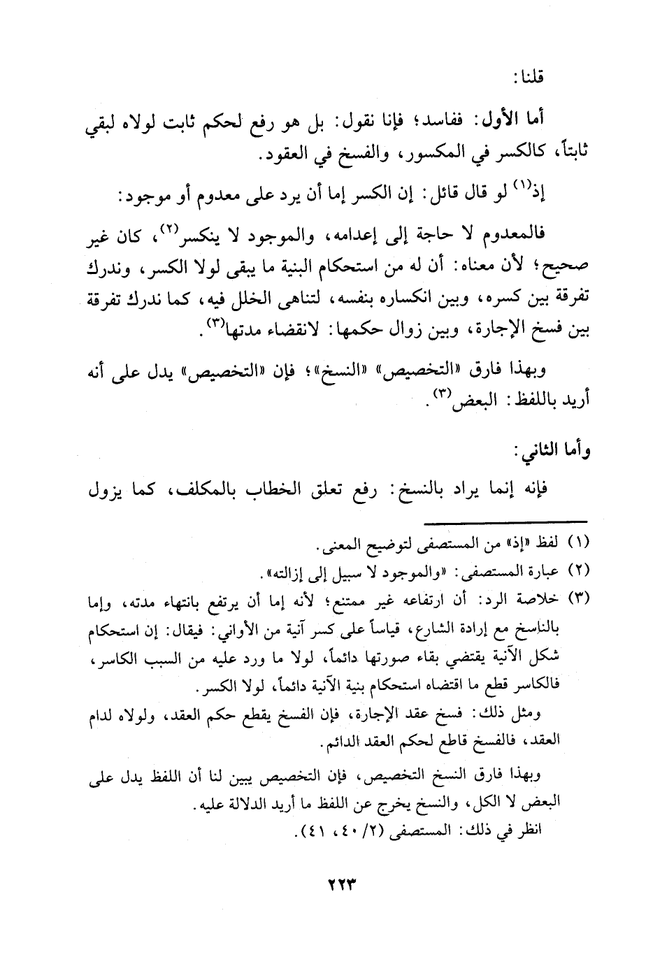 3 خلاصة الرد: أن ارتفاعه غير ممتنع؛ لأنه إما أن يرتفع بانتهاء مدته، وإما بالناسخ مع إرادة الشارع، قياسًا على كسر آنية من الأواني: فيقال: إن استحكام شكل الآنية يقتضي بقاء صورتها دائمًا، لولا ما ورد عليه من السبب الكاسر، فالكاسر قطع ما اقتضاه استحكام بنية الآنية دائمًا، لولا الكسر.