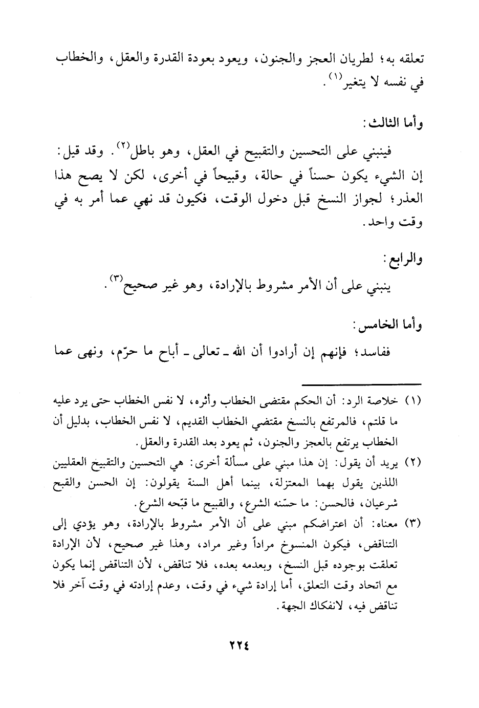 3 معناه: أن اعتراضكم مبني على أن الأمر مشروط بالإرادة، وهو يؤدي إلى التناقض، فيكون المنسوخ مرادًا وغير مراد، وهذا غير صحيح، لأن الإرادة تعلقت بوجوده قبل النسخ، وبعدمه بعده، فلا تناقض، لأن التناقض إنما يكون مع اتحاد وقت التعلق، أما إرادة شيء في وقت، وعدم إرادته في وقت آخر فلا تناقض فيه، لانفكاك الجهة.