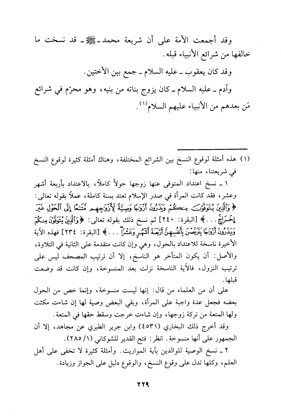 1 هذه أمثلة لوقوع النسخ بين الشرائع المختلفة، وهناك أمثلة كثيرة لوقوع النسخ في شريعتنا، منها: