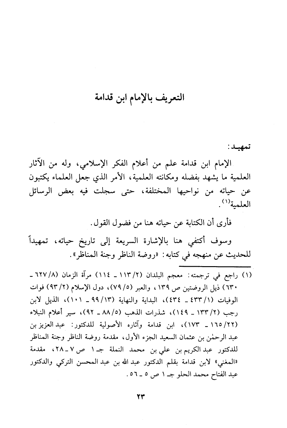1 راجع في ترجمته: معجم البلدان "2/ 113-114" مرآة الزمان "8/ 627-630" ذيل الروضتين ص139، والعبر "5/ 79"، دول الإسلام "2/ 93" فوات الوفيات "1/ 443-434"، البداية والنهاية "13/ 99-101"، الذيل لابن رجب "2/ 133-149"، شذرات الذهب "5/ 88-92"، سير أعلام النبلاء "22/ 165-173"، ابن قدامة وآثاره الأصولية للدكتور: عبد العزيز بن عبد الرحمن بن عثمان السعيد الجزء الأول، مقدمة روضة الناظر وجنة المناظر للدكتور عبد الكريم بن علي بن محمد النملة جـ1 ص7-28، مقدمة "المغني" لابن قدامة بقلم الدكتور عبد الله بن عبد المحسن التركي والدكتور عبد الفتاح محمد الحلو جـ1 ص5-56.