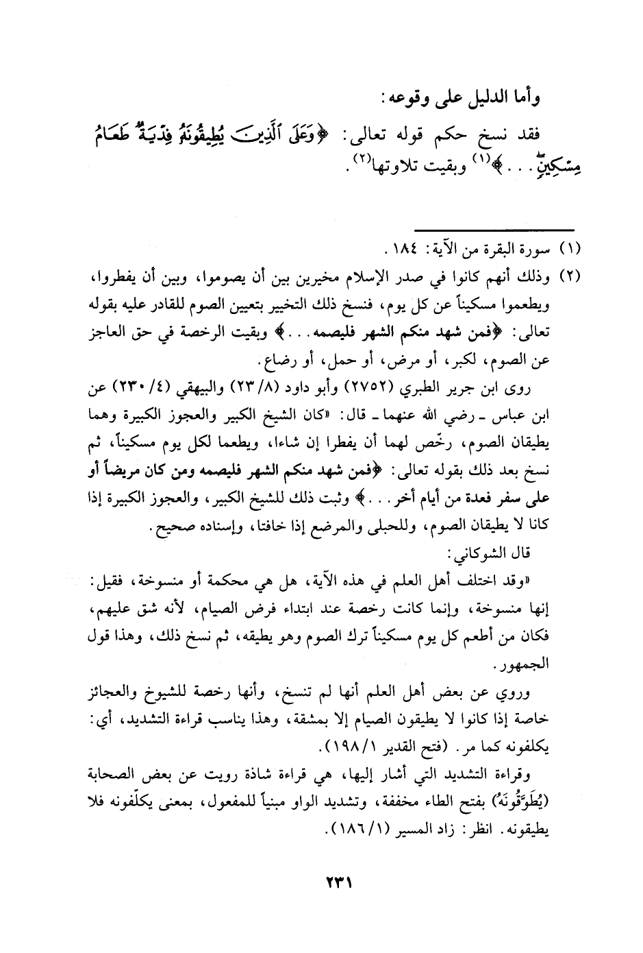 "وقد اختلف أهل العلم في هذه الآية، هل هي محكمة أو منسوخة، فقيل: إنها منسوخة، وإنما كانت رخصة عند ابتداء فرض الصيام، لأنه شق عليهم، فكان من أطعم كل يوم مسكينًا ترك الصوم، وهو يطيقه، ثم نسخ ذلك، وهذا قول الجمهور.