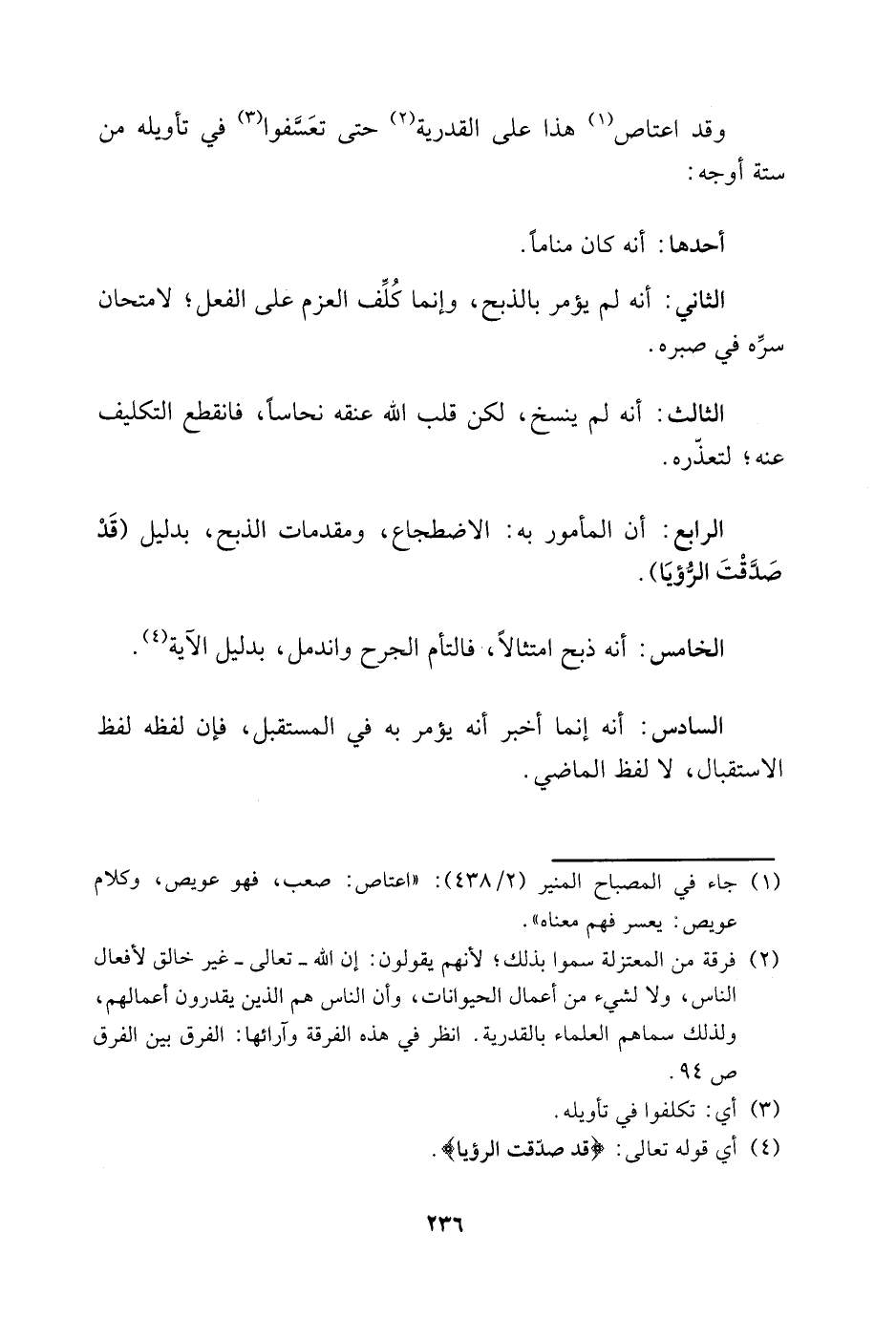 وقد اعتاص1 هذا على2 القدرية2 حتى تعَسَّفوا3 في تأويله من ستة أوجه: