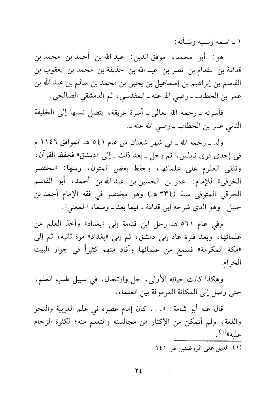 هو: أبو محمد، موفق الدين: عبد الله بن أحمد بن محمد بن قدامة بن مقدام بن نصر بن عبد الله بن حذيفة بن محمد بن يعقوب بن القاسم بن إبراهيم بن إسماعيل بن يحيى بن محمد بن سالم بن عبد الله بن عمر بن الخطاب -رضي الله عنه- المقدسي، ثم الدمشقي الصالحي.