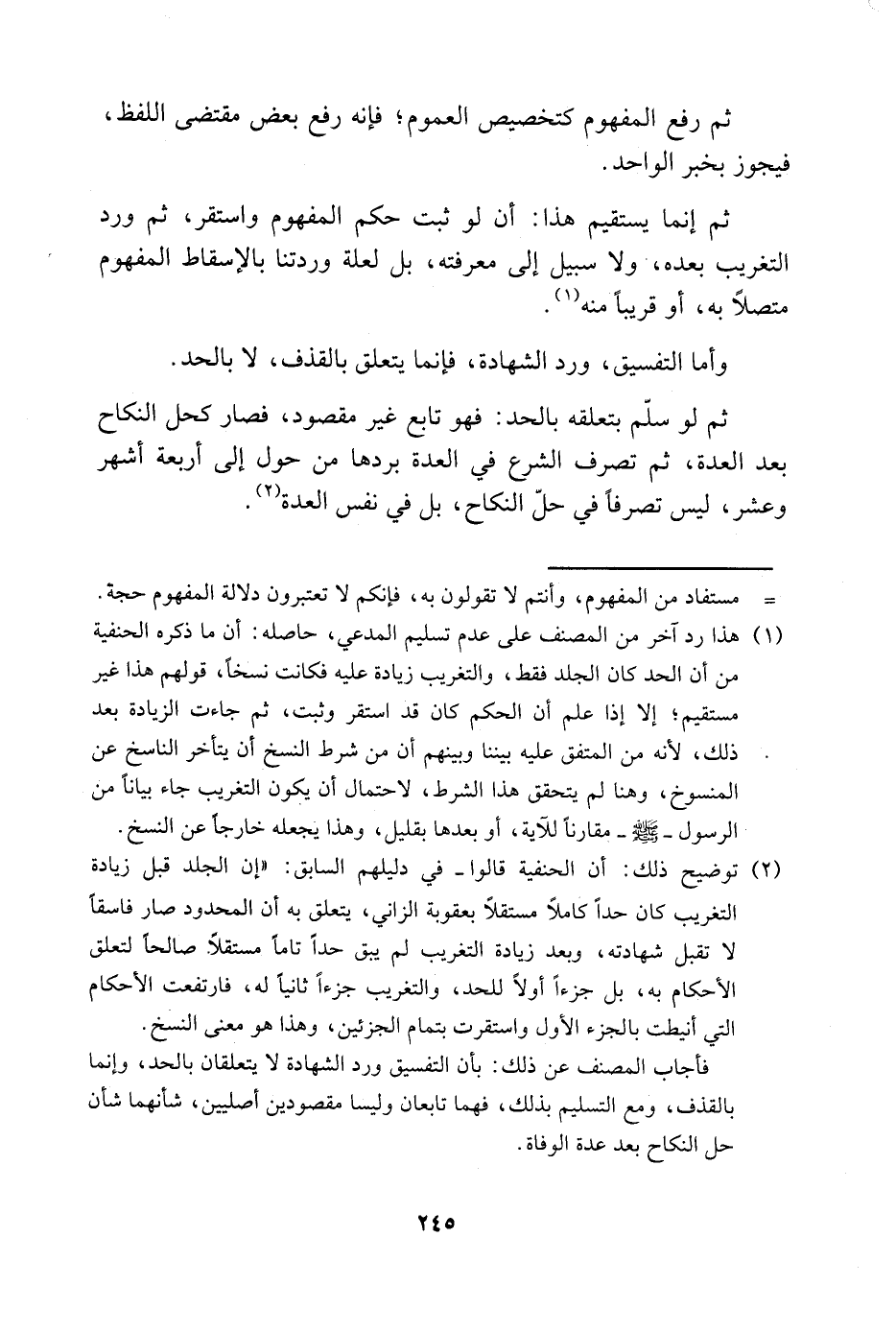 2 توضيح ذلك: أن الحنفية قالوا -في دليلهم السابق-: "إن الجلد قبل زيادة التغريب كان حدًّا كاملًا مستقلًّا بعقوبة الزاني، يتعلق به أن المحدود صار فاسقًا لا تقبل شهادته، وبعد زيادة التغريب لم يبقَ حدًّا تامًّا مستقلًّا صالحًا لتعلق الأحكام به، بل جزءًا أولًا للحد، والتغريب جزءًا ثانيًا له، فارتفعت الأحكام التي أنيطت بالجزء الأول واستقرت بتمام الجزئين، وهذا هو معنى النسخ.