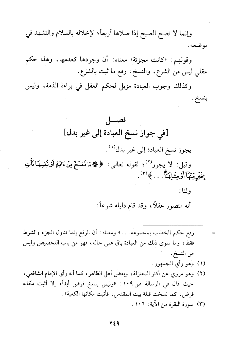 وقيل: لا يجوز2، لقوله تعالى: {مَا نَنْسَخْ مِنْ آيَةٍ أَوْ نُنْسِهَا نَأْتِ بِخَيْرٍ مِنْهَا أَوْ مِثْلِهَا....} 3.