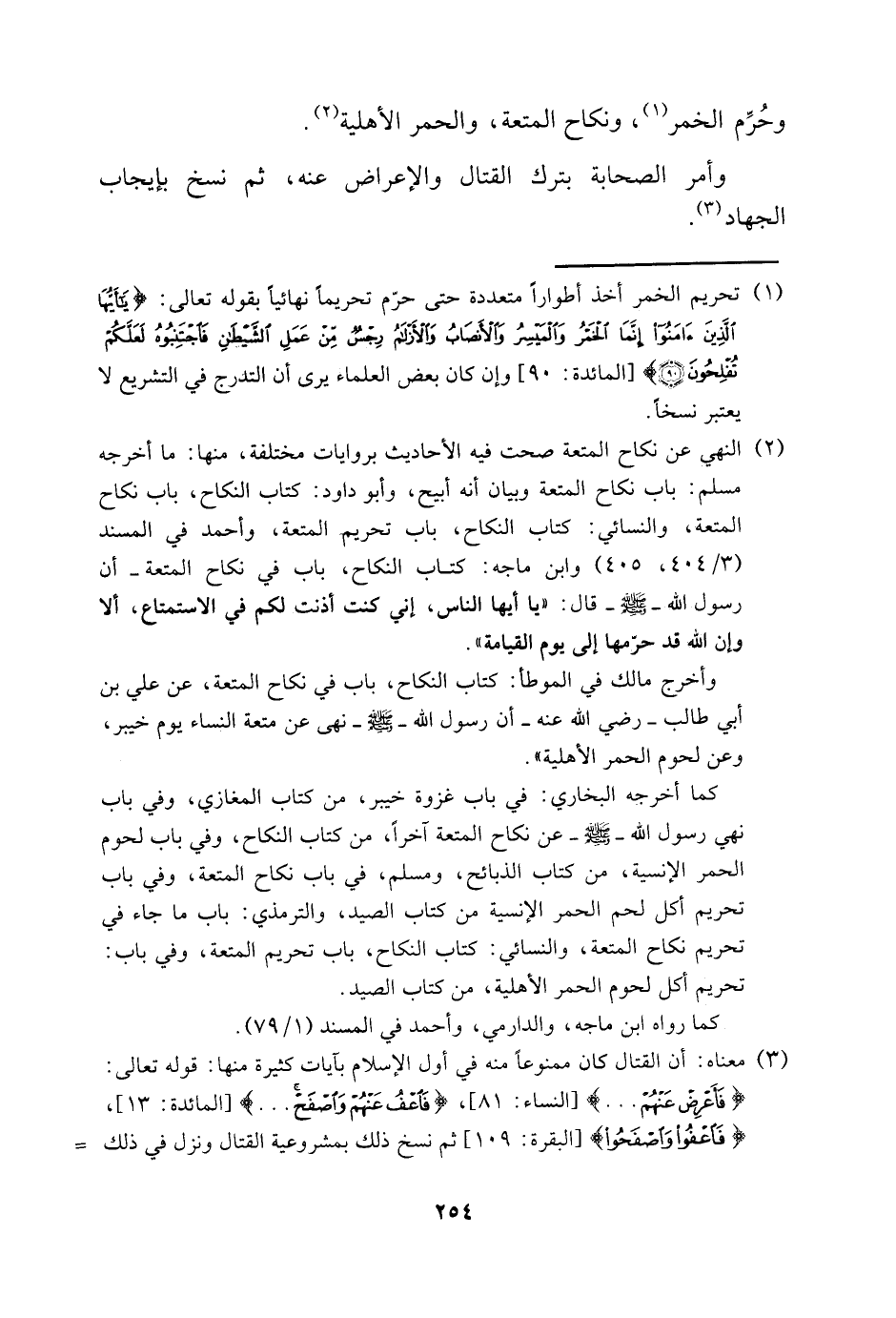 1 تحريم الخمر أخذ أطوارًا متعددة حتى حرم تحريمًا نهائيًّا، بقوله تعالى: {يَا أَيُّهَا الَّذِينَ آمَنُوا إِنَّمَا الْخَمْرُ وَالْمَيْسِرُ وَالْأَنْصَابُ وَالْأَزْلامُ رِجْسٌ مِنْ عَمَلِ الشَّيْطَانِ فَاجْتَنِبُوهُ لَعَلَّكُمْ تُفْلِحُونَ} [المائدة: 90] وإن كان بعض العلماء يرى أن التدرج في التشريع لا يعتبر نسخًا.