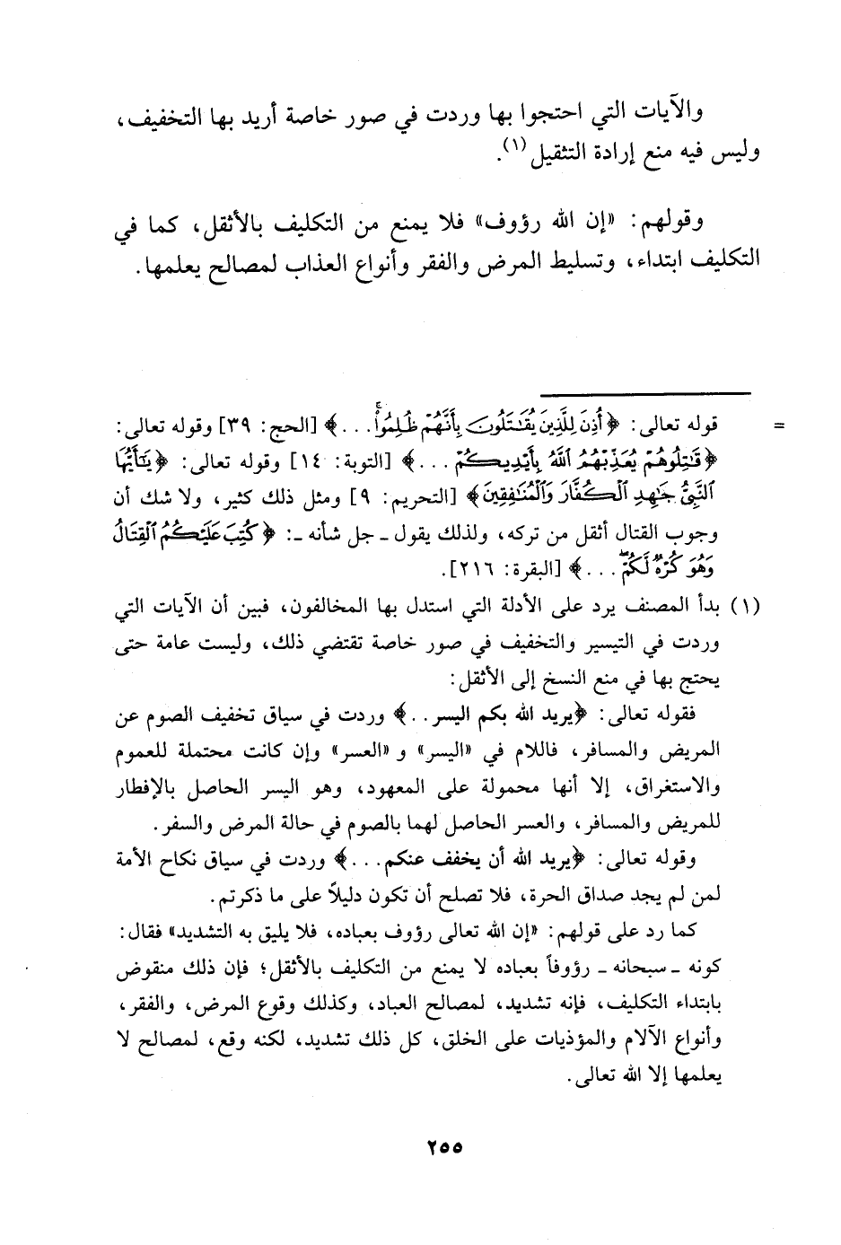 1 بدأ المصنف يرد على الأدلة التي استدل بها المخالفون، فبين أن الآيات التي وردت في التيسير والتخفيف في صور خاصة تقتضي ذلك، وليست عامة حتى يحتج بها في منع النسخ إلى الأثقل: