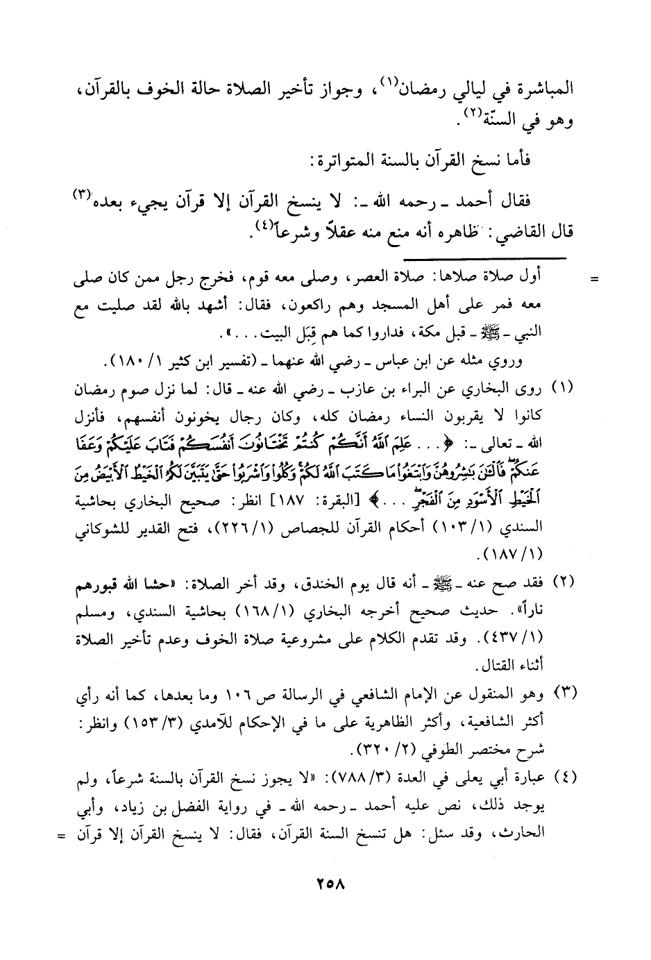 4 عبارة أبي يعلى في العدة "3/ 788": "لا يجوز نسخ القرآن بالسنة شرعًا، ولم يوجد ذلك، نص عليه أحمد -رحمه الله- في رواية الفضل بن زياد، وأبي الحارث، وقد سئل: هل تنسخ السنة القرآن، فقال: لا ينسخ القرآن إلا قرآن =