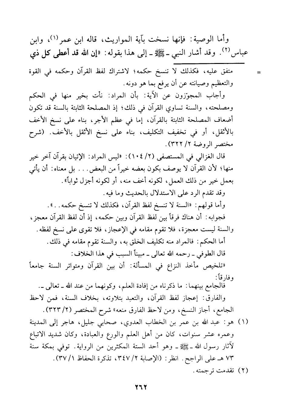 وأجاب المجوزون عن الآية: بأن المراد: نأت بخير منها في الحكم ومصلحته، والسنة تساوى القرآن في ذلك؛ إذ المصلحة الثابتة بالسنة قد تكون أضعاف المصلحة الثابتة بالقرآن، إما في عظم الأجر، بناء على نسخ الأخف بالأثقل، أو في تخفيف التكليف، بناء على نسخ الأثقل بالأخف. "شرح مختصر الروضة 2/ 322".
