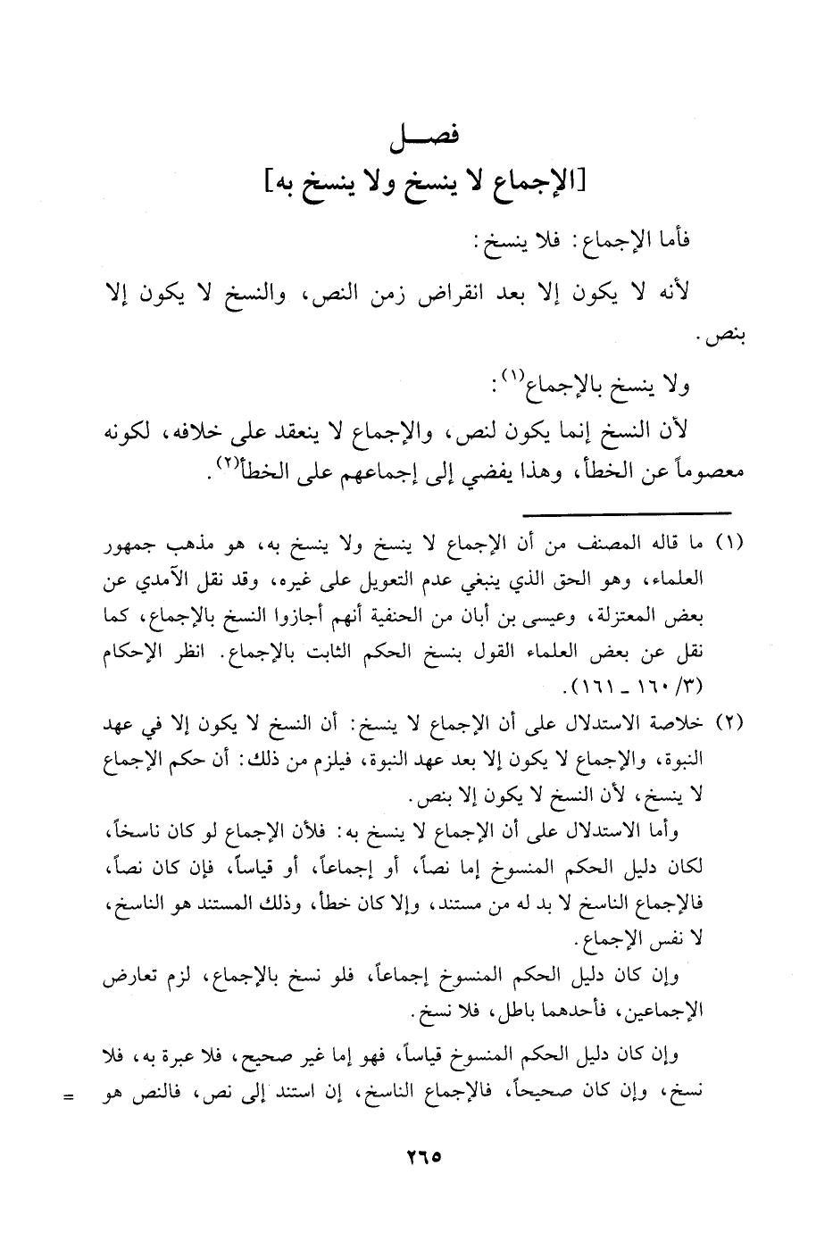 وأما الاستدلال على أن الإجماع لا ينسخ به: فلأن الإجماع لو كان ناسخًا، لكان دليل الحكم المنسوخ إما نصًّا، أو إجماعًا، أو قياسًا، فإن كان نصًّا، فالإجماع الناسخ لا بد له من مستند، وإلا كان خطأ، وذلك المستند هو الناسخ، لا نفس الإجماع.