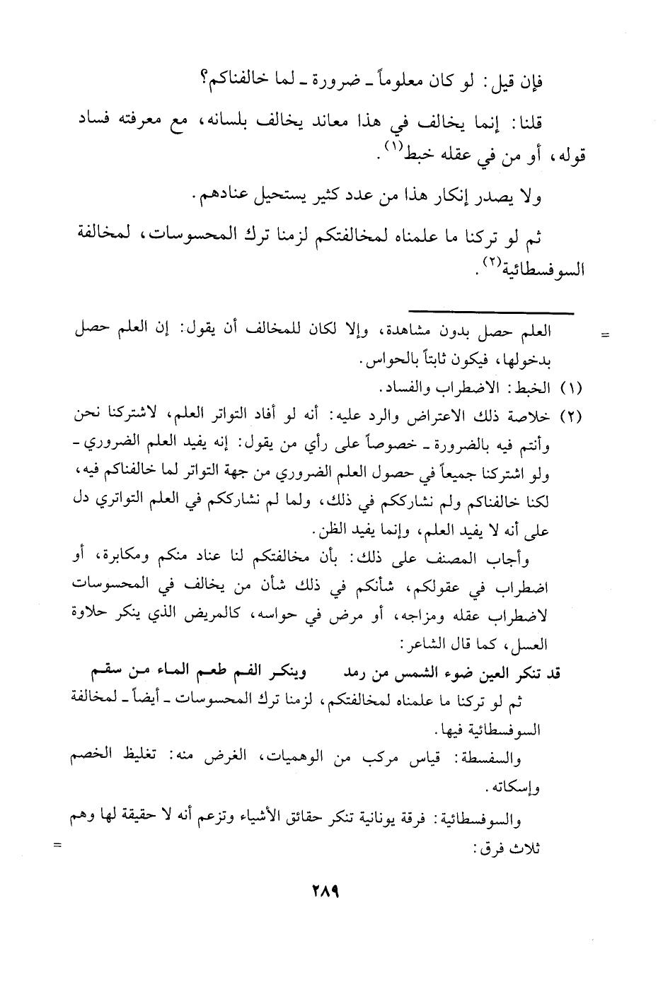 ثم لو تركنا ما علمناه لمخالفتكم، لزمنا ترك المحسوسات -أيضًا- لمخالفته السوفسطائية فيها.