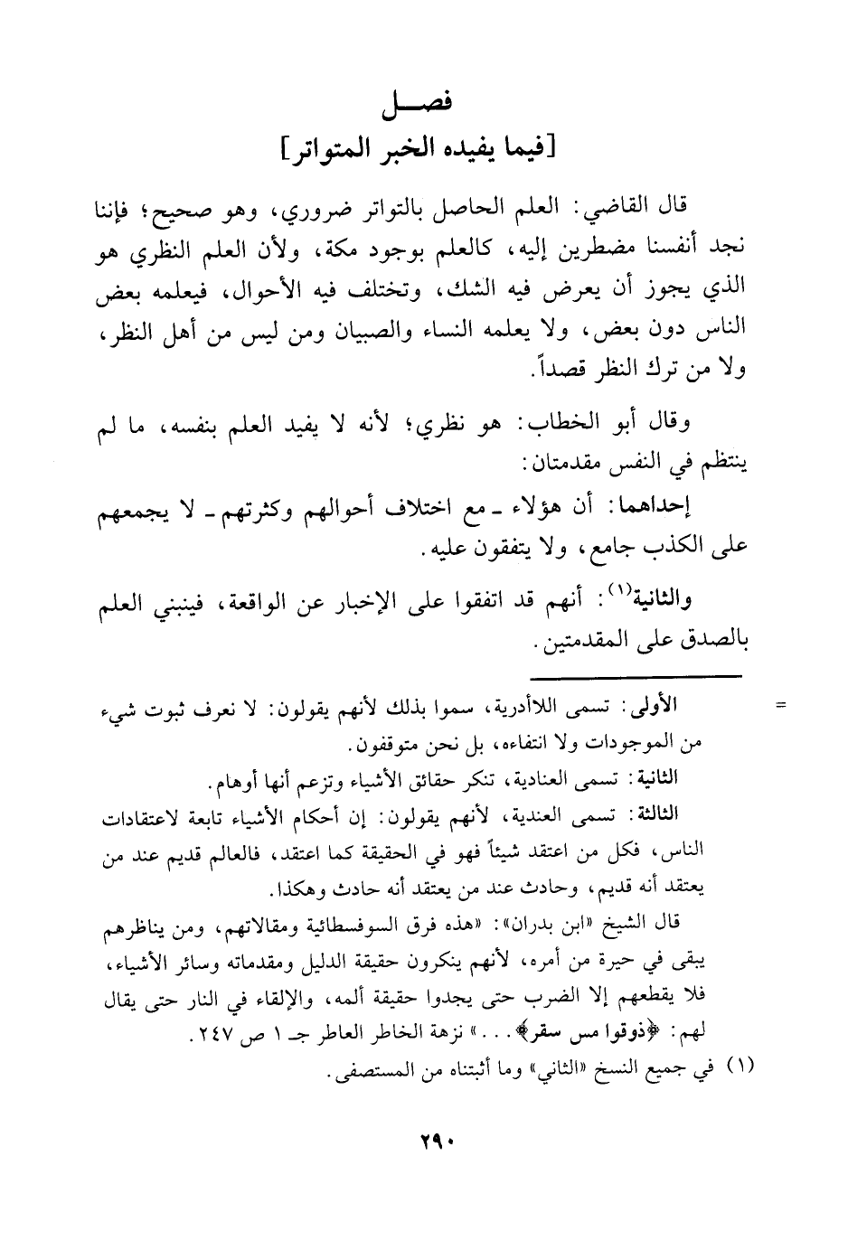 قال القاضي: العلم الحاصل بالتواتر ضروري، وهو صحيح؛ فإننا نجد أنفسنا مضطرين إليه، كالعلم بوجود مكة، ولأن العلم النظري هو الذي يجوز أن يعرض فيه الشك، وتختلف فيه الأحوال، فيعلمه بعض الناس دون بعض، ولا يعلمه النساء والصبيان ومن ليس من أهل النظر، ولا من ترك النظر قصدًا.