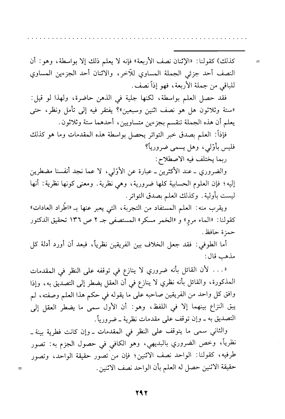 والضروري -عند الأكثرين- عبارة عن الأولى، لا عما نجد أنفسنا مضطرين إليه؛ فإن العلوم الحسابية كلها ضرورية، وهي نظرية, ومعنى كونها نظرية: أنها ليس بأولية. وكذلك العلم بصدق التواتر.