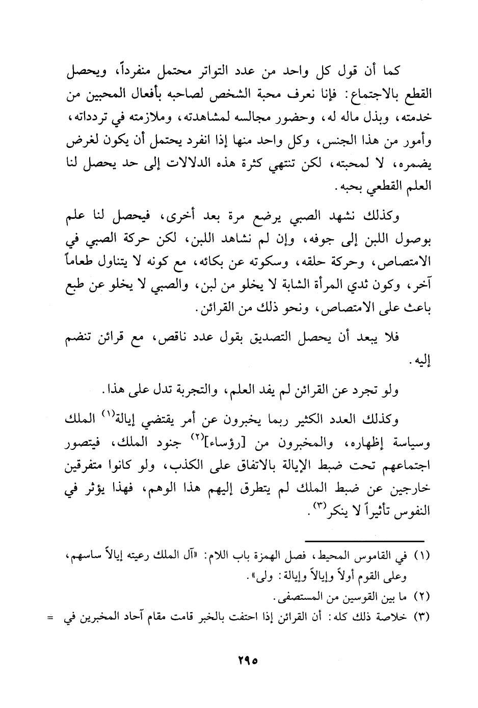 كما أن قول كل واحد من عدد التواتر محتمل منفردًا، ويحصل القطع بالاجتماع: فإنا نعرف محبة الشخص لصاحبه بأفعال المحبين من خدمته، وبذل ماله له، وحضوره مجالسه لمشاهدته، وملازمته في تردداته، وأمور من هذا الجنس، وكل واحد منها إذ انفرد يحتمل أن يكون لغرض يضمره، لا لمحبته، لكن تنتهي كثرة هذه للدلالات إلى حد يحصل لنا العلم القطعي بحبه.