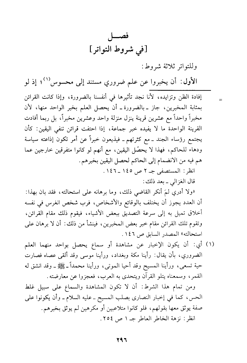 1 أي: أن يكون الإخبار عن مشاهدة أو سماع يحصل بواحد منهما العلم الضروري، بأن القول: رأينا مكة وبغداد، ورأينا موسى وقد ألقى عصاه فصارت حية تسعى، ورأينا المسيح وقد أحيا الموتى، ورأينا محمدًا -صلى الله عليه وسلم- وقد انشق له القمر، وسمعناه يتلو القرآن ويتحدى به العرب، فعجزوا عن معارضته.