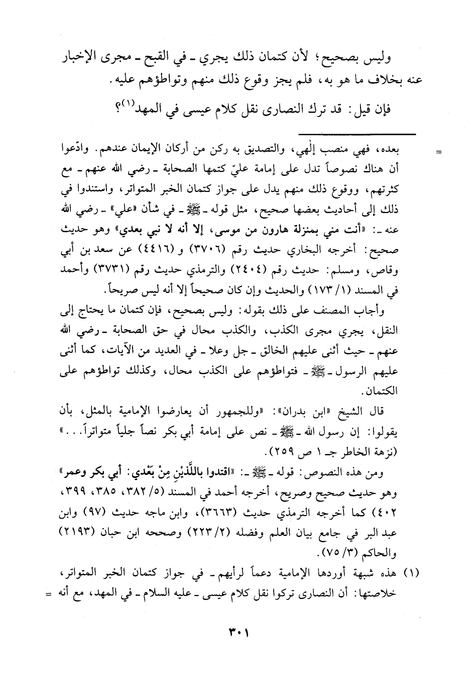 1 هذه شبهة: أوردها الإمامية دعمًا لرأيهم -في جواز كتمان الخبر المتواتر-، خلاصتها: أن النصارى تركوا كلام عيسى -عليه السلام- في المهد، مع أنه =