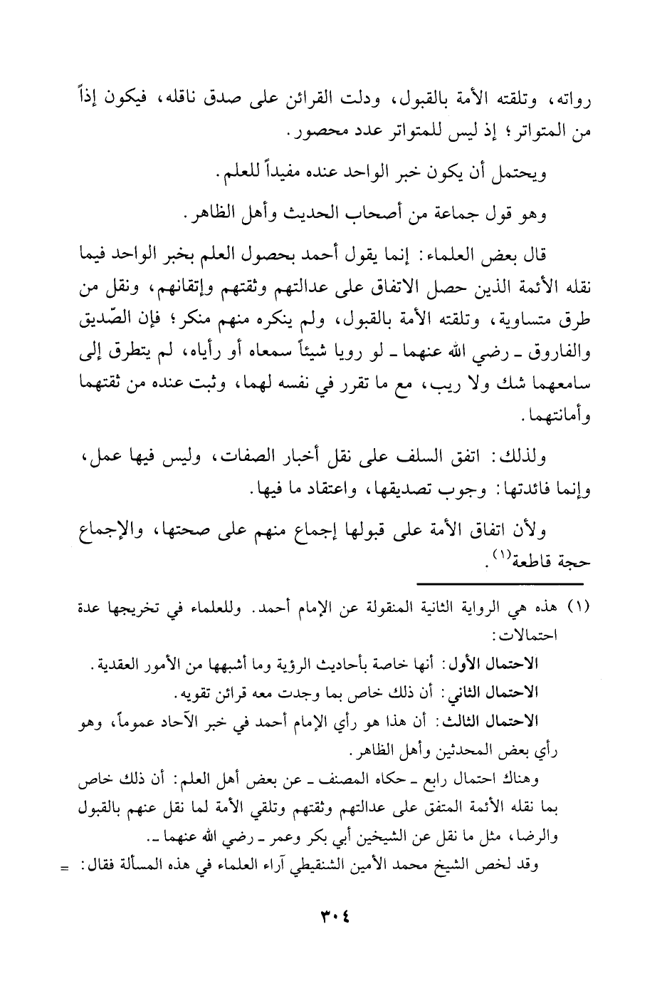 قال بعض العلماء: إنما يقول أحمد بحصول العلم بخبر الواحد فيما نقله الأئمة الذين حصل الاتفاق على عدالتهم وثقتهم وإتقانهم، ونقل من طرق متساوية، وتلقته الأمة بالقبول، ولم ينكره منهم منكر؛ فإن الصديق والفاروق -رضي الله عنهما- لو رويا شيئا سمعاه أو رأياه، لم يتطرق إلى سامعهما شك ولا ريب، مع ما تقرر في نفسه لهما، وثبت عنده من ثقتهما وأمانتهما.