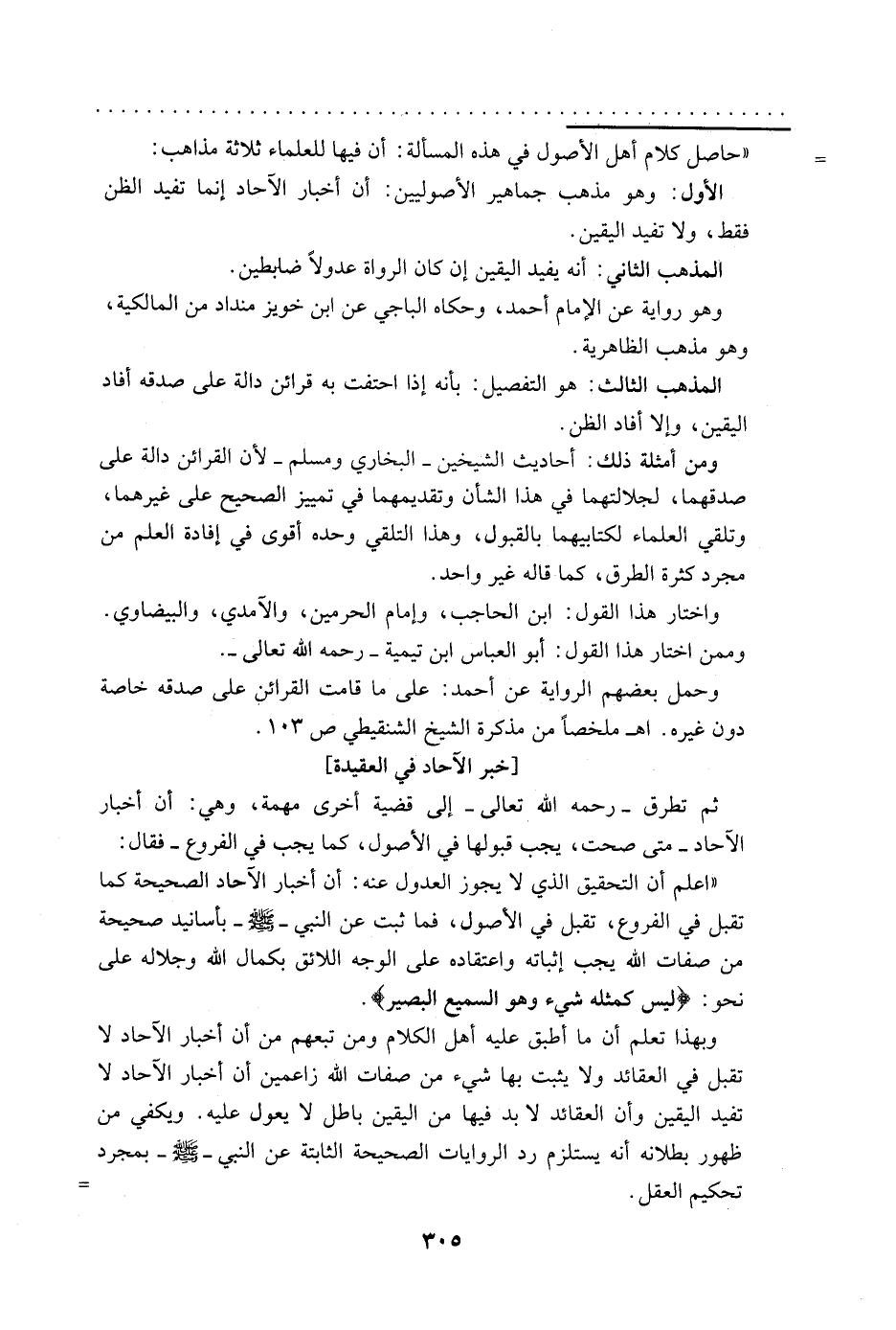 وبهذا تعلم أن ما أطبق عليه أهل الكلام ومن تبعهم من أن أخبار الآحاد لا تقبل في العقائد ولا ثبت بها شيء من صفات الله زاعمين أن أخبار الآحاد لا تفيد اليقين وأن العقائد لا بد فيها من اليقين باطل لا يعول عليه. ويكفي من ظهور بطلانه أنه يستلزم رد الروايات الصحيحة الثابتة عن النبي -صلى الله عليه وسلم- بمجرد تحكيم العقل.