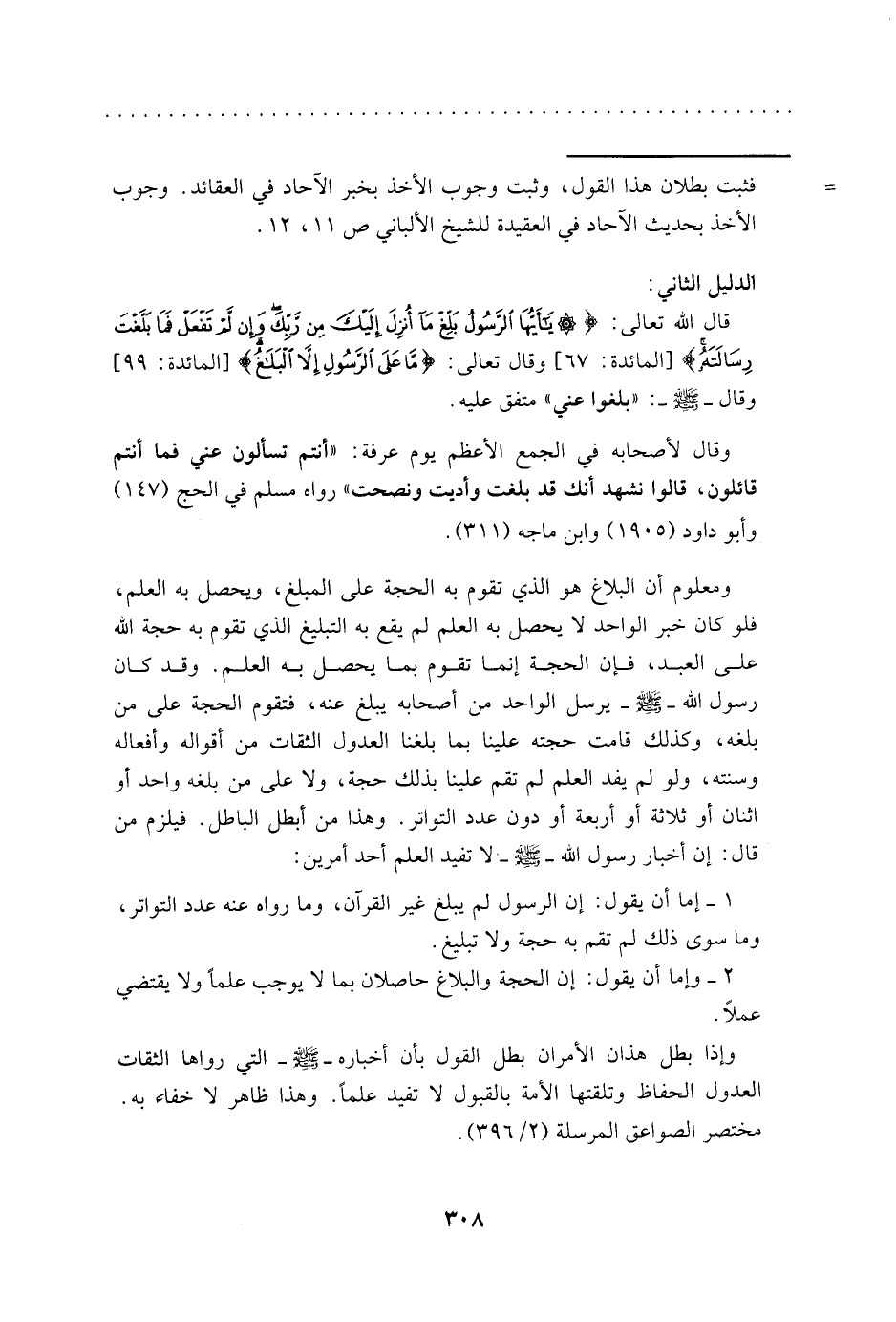 ومعلوم أن البلاغ هو الذي تقوم به الحجة على المبلغ، ويحصل به العلم، فلو كان خبر الواحد، لا يحصل به العلم لم يقع به التبليغ الذي تقوم به حجة الله على العبد، فإن الحجة إنما تقوم بما يحصل به العلم. وقد كان رسول الله -صلى الله عليه وسلم- يرسل الواحد من أصحابه يبلغ عنه، فتقوم الحجة على من بلغه، وكذلك قامت حجته علينا بما بلغنا العدول الثقات من أقواله وأفعاله وسنته، ولو لم يفد العلم لم تقم علينا بذلك حجة، ولا على من بلغه واحد أو اثنان أو ثلاثة أو أربعة أو دون عدد التواتر. وهذا من أبطل الباطل. فيلزم من قال: إن أخبار الرسول -صلى الله عليه وسلم- لا تفيد العلم أحد أمرين: