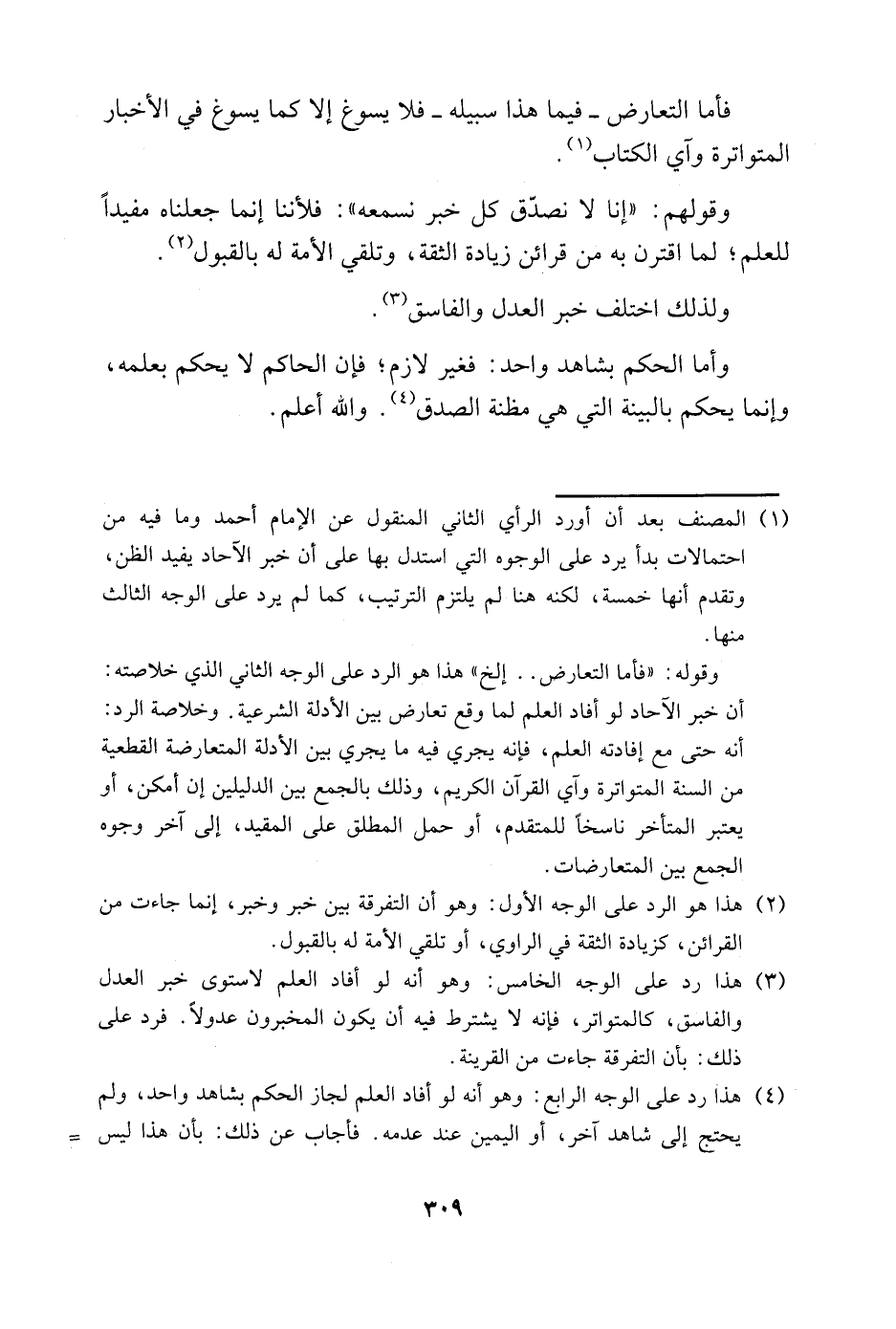 3 هذا رد على الوجه الخامس: وهو أنه لو أفاد العلم لاستوى خبر العدل والفاسق، كالمتواتر، فإنه لا يشترط فيه أن يكون المخبرون عدولًا. فرد على ذلك: بأن التفرقة جاءت من القرينة.