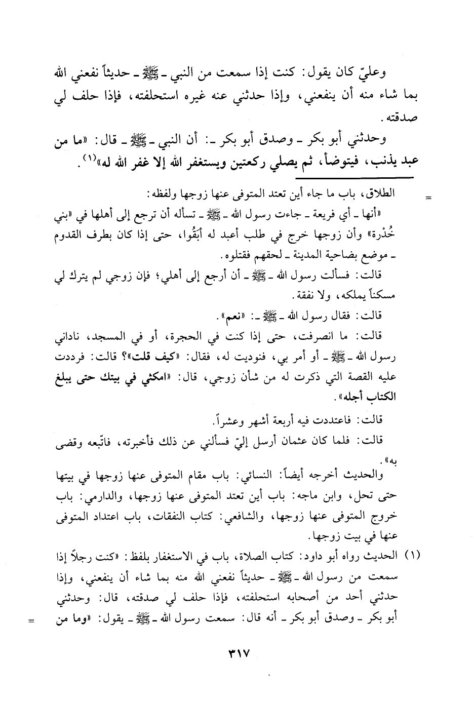 1 الحديث رواه أبو داود: كتاب الصلاة، باب في الاستغفار بلفظ: "كنت رجلًا إذا سمعت من رسول الله -صلى الله عليه وسلم- حديثًا نفعني الله منه بما شاء أن ينفعني، وإذا حدثني أحد من أصحابه استحلفته، فإذا حلف لي صدقته، قال: وحدثني أبو بكر -وصدق أبو بكر- أنه قال: سمعت رسول الله -صلى الله عليه وسلم- يقول: "وما من =