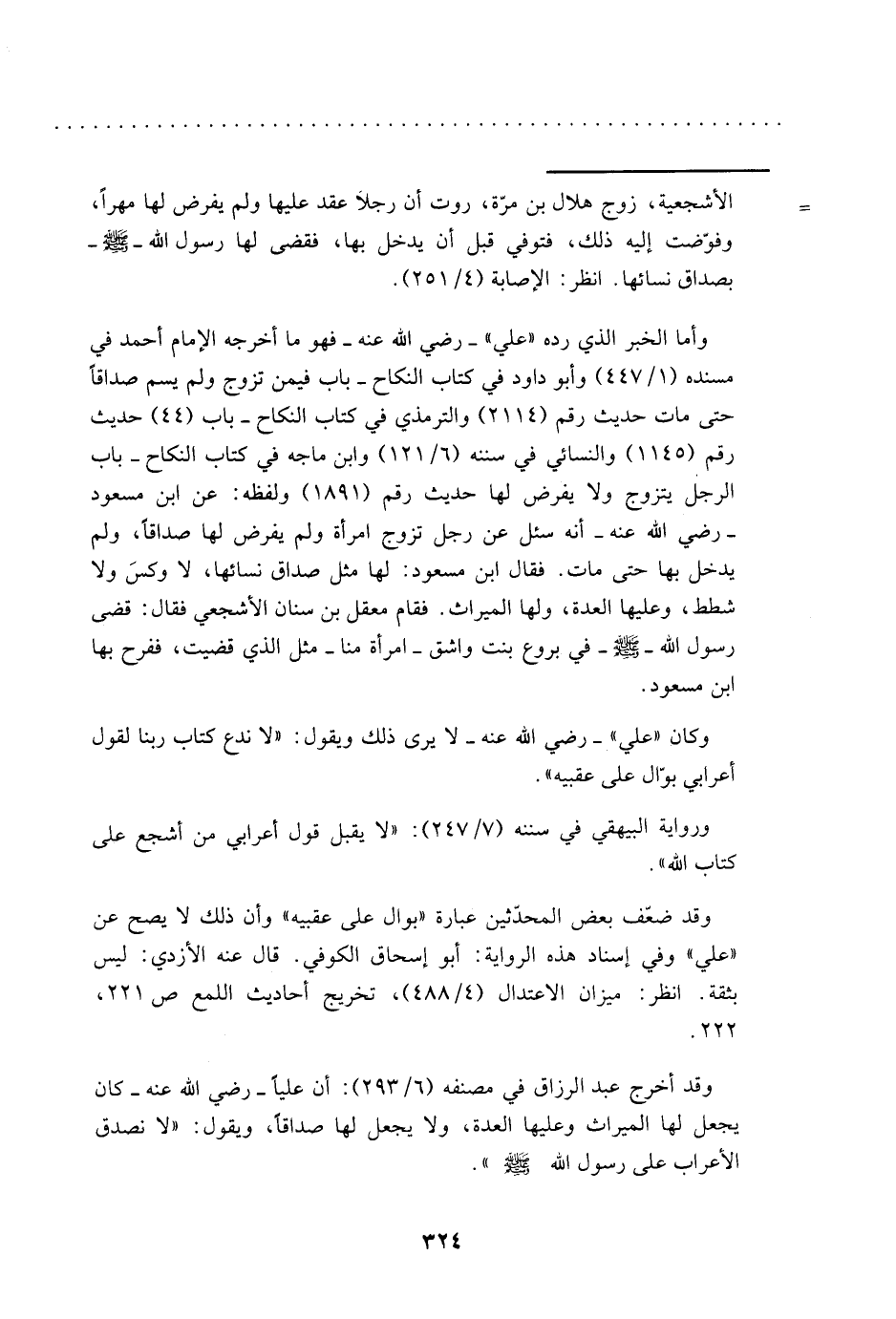 وقد أخرج عبد الرزاق في مصنفه "6/ 293": أن عليًّا -رضي الله عنه- كان يجعل لها الميراث وعليها العدة، ولا يجعل لها صداقا، ويقول: "لا نصدق الأعراب على رسول الله -صلى الله عليه وسلم-".