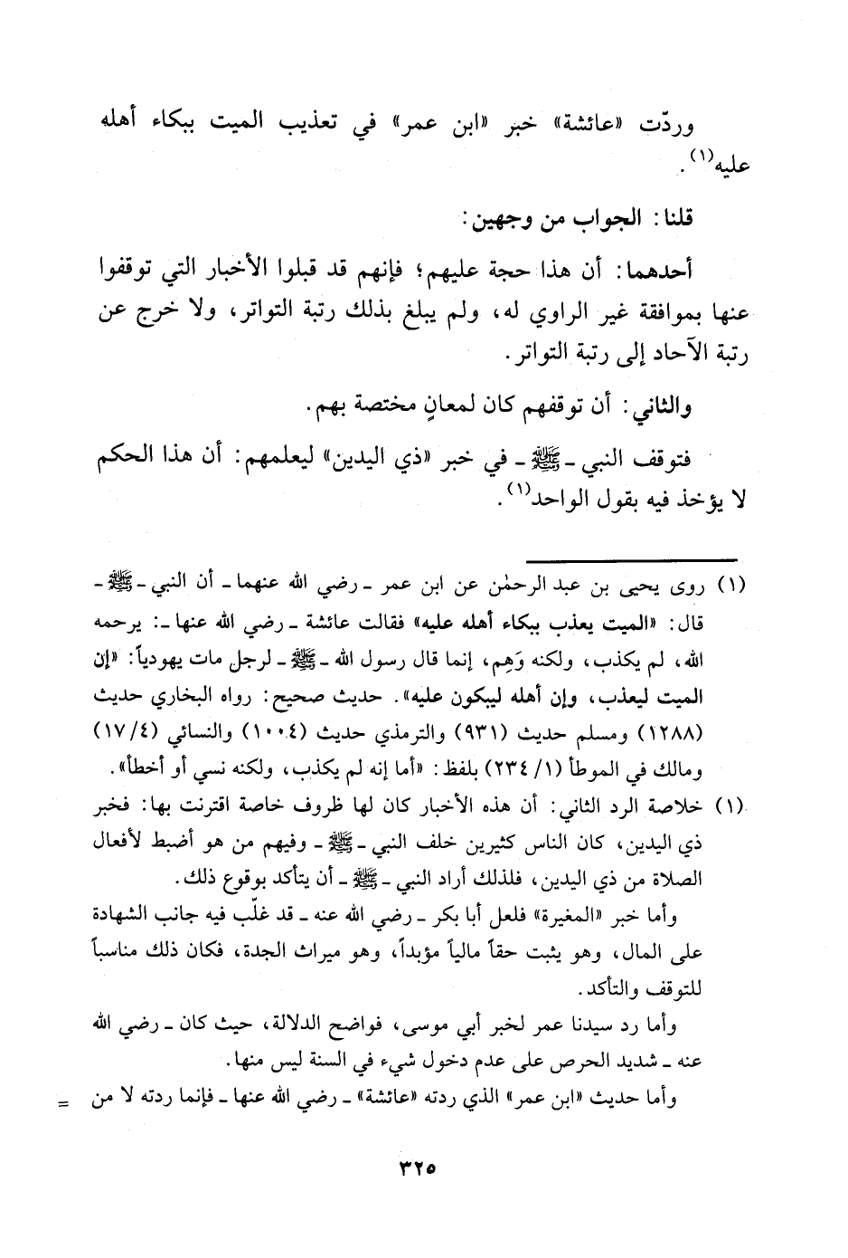 1 روى يحيي بن عبد الرحمن عن ابن عمر -رضي الله عنهما- أن النبي -صلى الله عليه وسلم- قال: "الميت يعذب ببكاء أهله عليه" فقالت عائشة -رضي الله عنها-: يرحمه الله، لم يكذب، ولكنه وهم، إنما قال رسول الله -صلى الله عليه وسلم- لرجل مات يهوديًّا: "إن الميت ليعذب، وإن أهله ليبكون عليه". حديث صحيح: رواه البخاري حديث "1288" ومسلم حديث "391" والترمذي حديث "100" والنسائي "4/ 17" ومالك في الموطأ "1/ 234" بلفظ: "أما إنه لم يكذب، ولكنه نسي أو أخطأ".