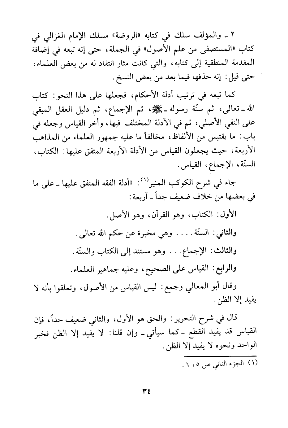 2- والمؤلف سلك في كتابه "الروضة" مسلك الإمام الغزالي في كتاب "المستصفى من علم الأصول" في الجملة، حتى إنه تبعه في إضافة المقدمة المنطقية إلى كتابه، والتي كانت مثار انتقاد له من بعض العلماء، حتى قيل: إنه حذفها فيما بعد من بعض النسخ.