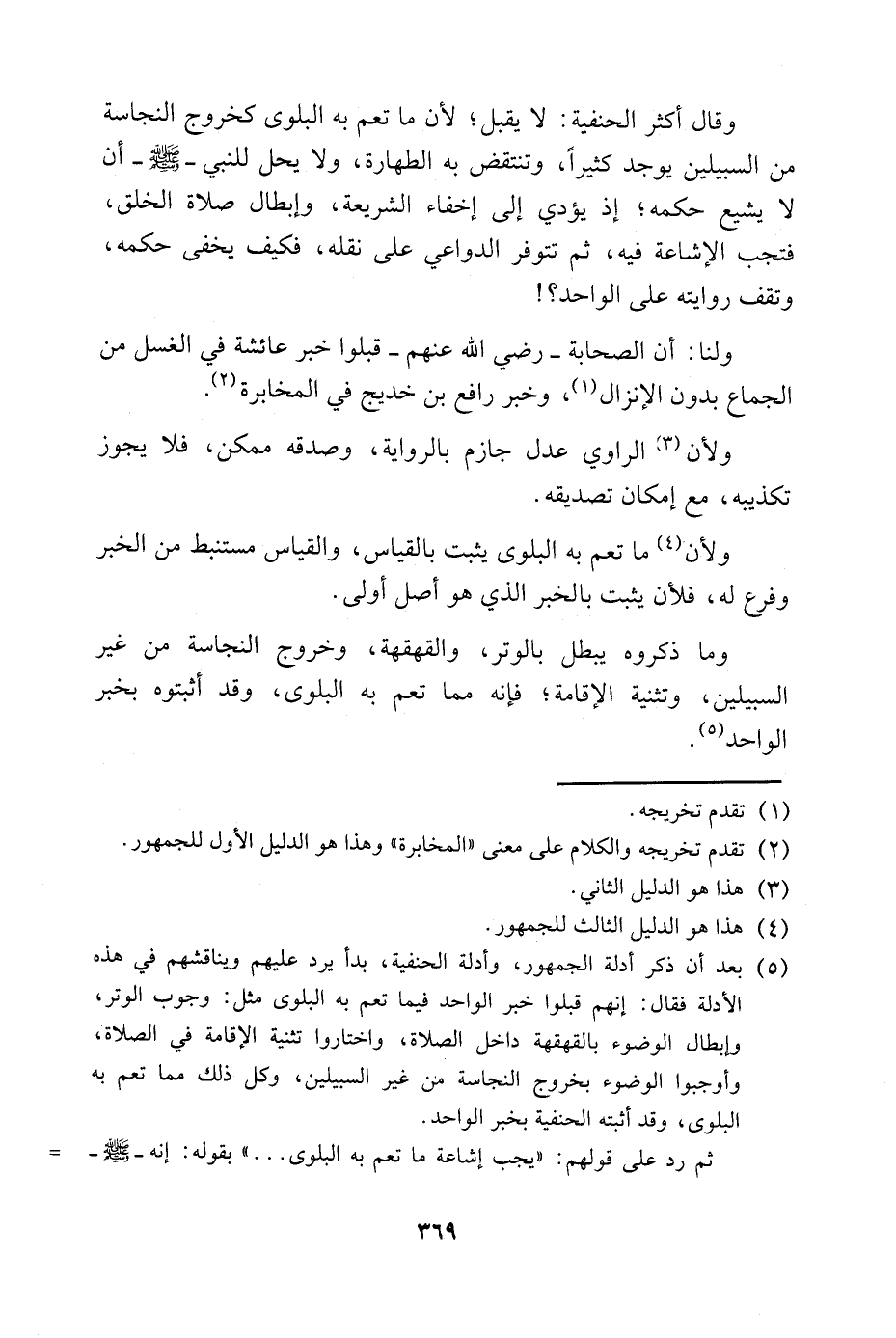5 بعد أن ذكر أدلة الجمهور، وأدلة الحنفية، بدأ يرد عليهم ويناقشهم في هذه الأدلة فقال: إنهم قبلوا خبر الواحد فيما يعم به البلوى مثل: وجوب الوتر، وإبطال الوضوء بالقهقهة داخل الصلاة، واختاروا تثنية الإقامة في الصلاة، وأوجبوا الوضوء بخروج النجاسة من غير السبيلين، وكل ذلك مما تعم به البلوى، وقد أثبته الحنفية بخبر الواحد.