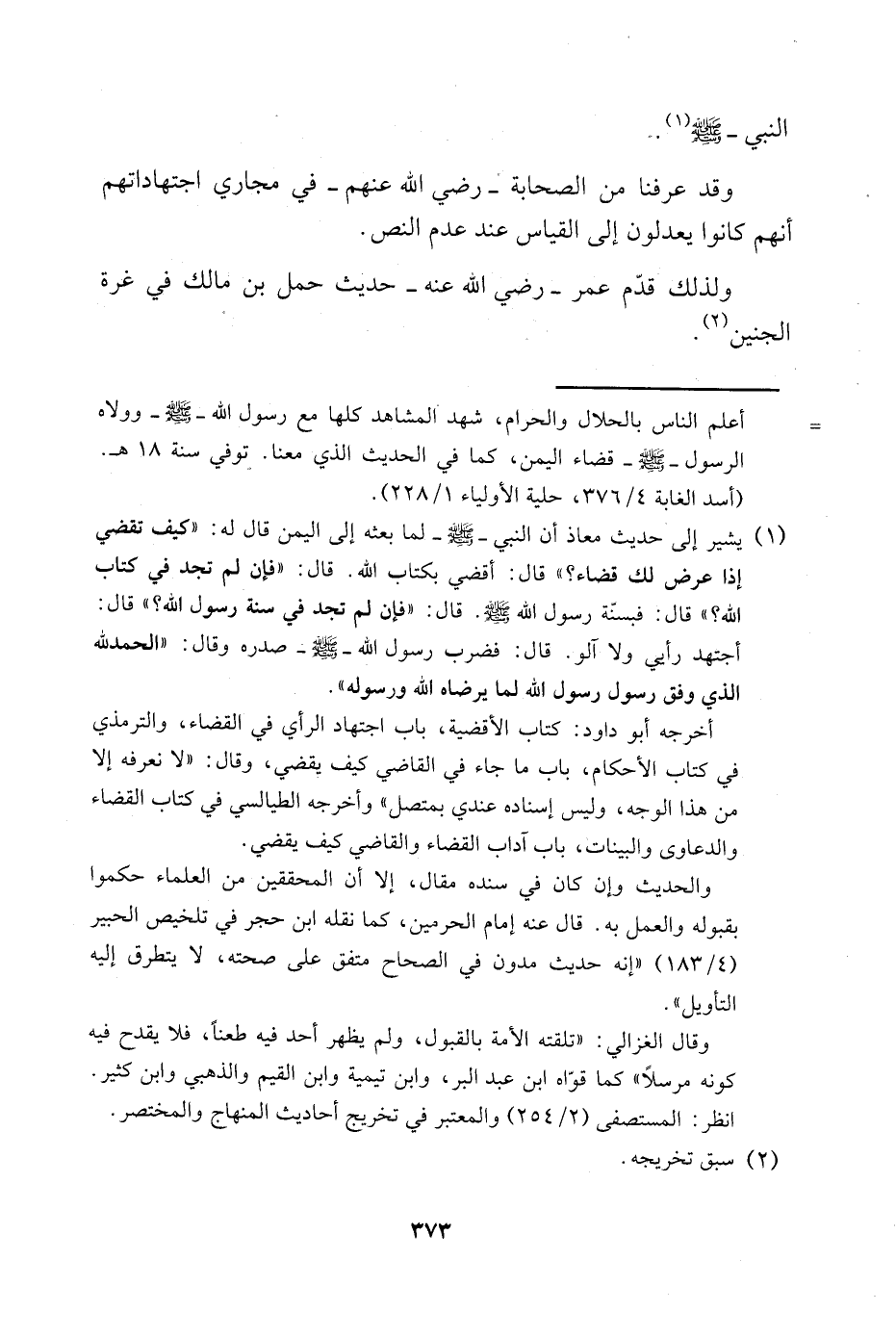 1 يشير إلى حديث معاذ أن النبي -صلى الله عليه وسلم- لما بعثه إلى اليمن قال له: "كيف تقضي إذا عرض لك القضاء؟ " قال: أقضى بكتاب الله. قال: "فإن لم تجد في كتاب الله؟ " قال: فبسنة رسول الله -صلى الله عليه وسلم-. قال: "فإن لم تجد في سنة رسول الله؟ " قال: أجتهد رأيي ولا آلو. قال: فضرب رسول الله -صلى الله عليه وسلم- صدره وقال: "الحمد لله الذي وفق رسول رسول الله لما يرضاه الله ورسوله".