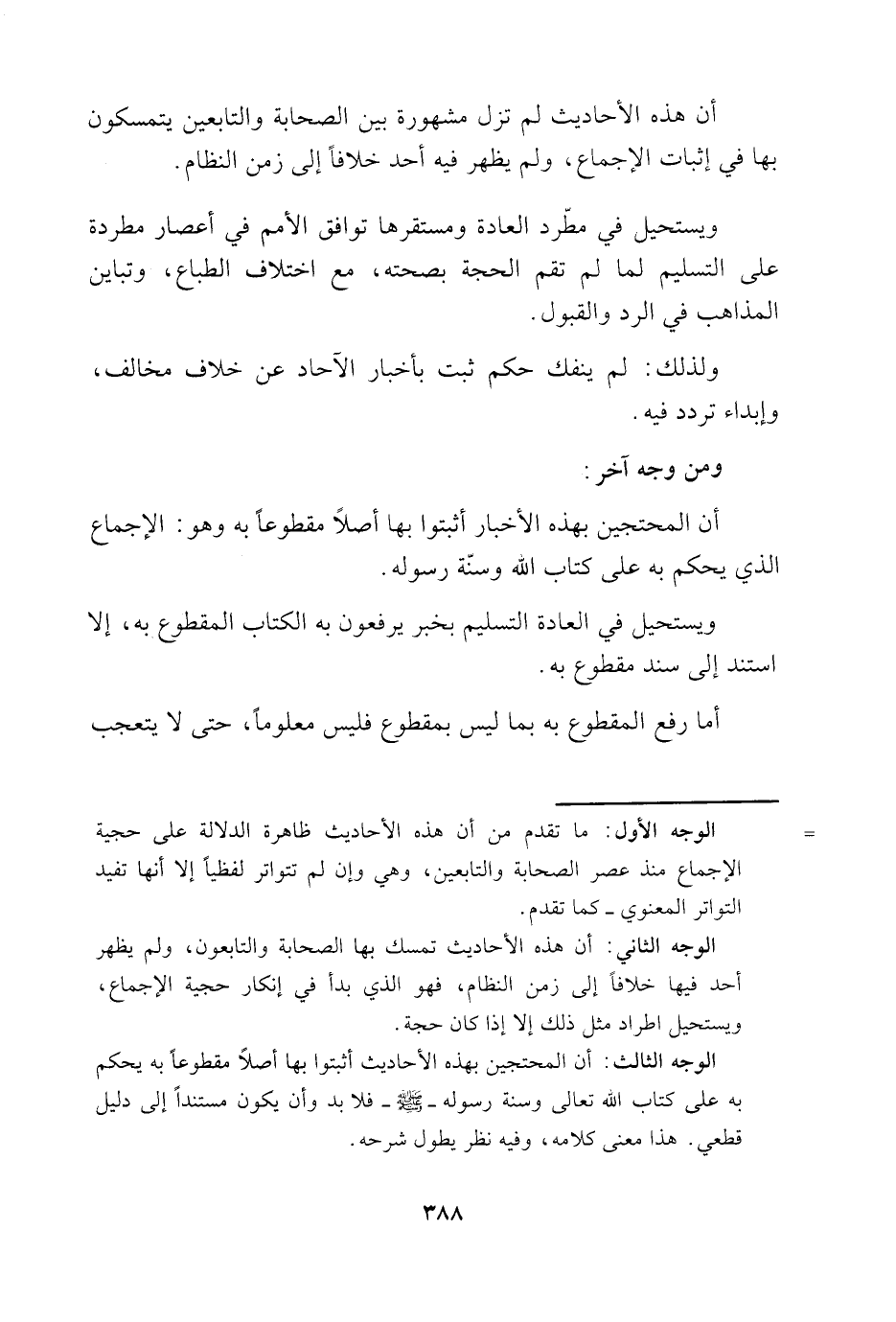 = الوجه الأول: ما تقدم من أن هذه الأحاديث ظاهرة الدلالة على حجية الإجماع منذ عصور الصحابة والتابعين، وهي وإن لم تتواتر لفظيًّا إلا أنها تفيد التواتر المعنوي كما تقدم.