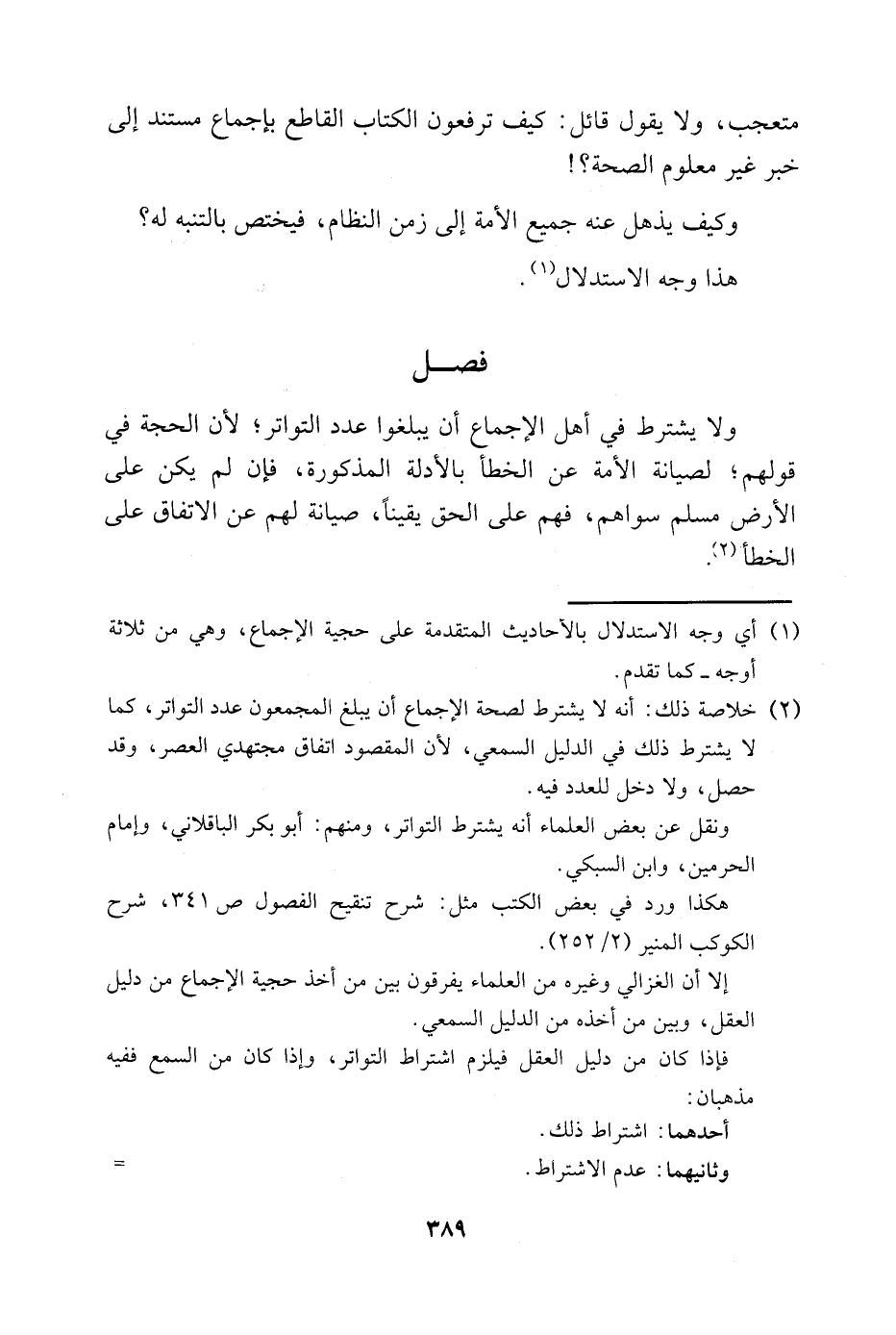 2 خلاصة ذلك: أنه لا يشترط لصحة الإجماع أن يبلغ المجمعون عدد التواتر كما لا يشترط ذلك في الدليل السمعي، لأن المقصود اتفاق مجتهدي العصر، وقد حصل، ولا دخل للعدد فيه.