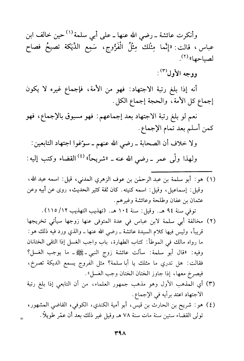 3 أي المذهب الأول وهو مذهب جمهور العلماء، من أن التابعي إذا بلغ رتبة الاجتهاد اعتد برأيه في الإجماع.