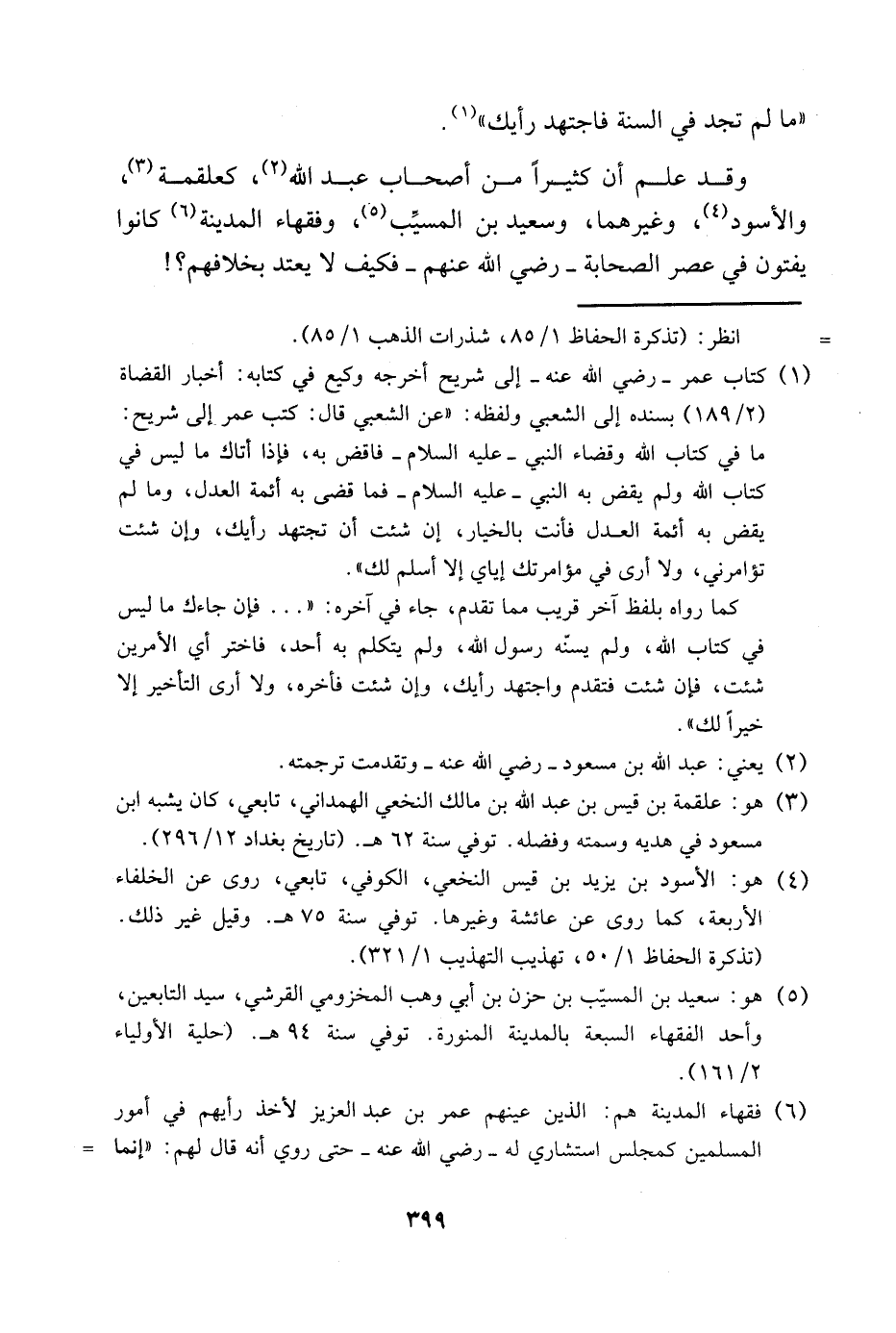 1 كتاب عمر -رضي الله عنه- إلى شريح أخرجه وكيع في كتابه: أخبار القضاة "2/ 189" بسنده إلى الشعبي ولفظه: "عن الشعبي قال: كتب عمر إلى شريح: ما في كتاب الله وقضاء النبي -صلى الله عليه وسلم- فاقض به، فإذا أتاك ما ليس في كتاب الله ولم يقض به النبي -عليه السلام- فما قضى به أئمة العدل، وما لم يقض به أئمة العدل فأنت بالخيار، إن شئت أن تجتهد رأيك، وإن شئت تؤامرني، ولا أرى في مؤامرتك إياي إلا أسلم ذلك".