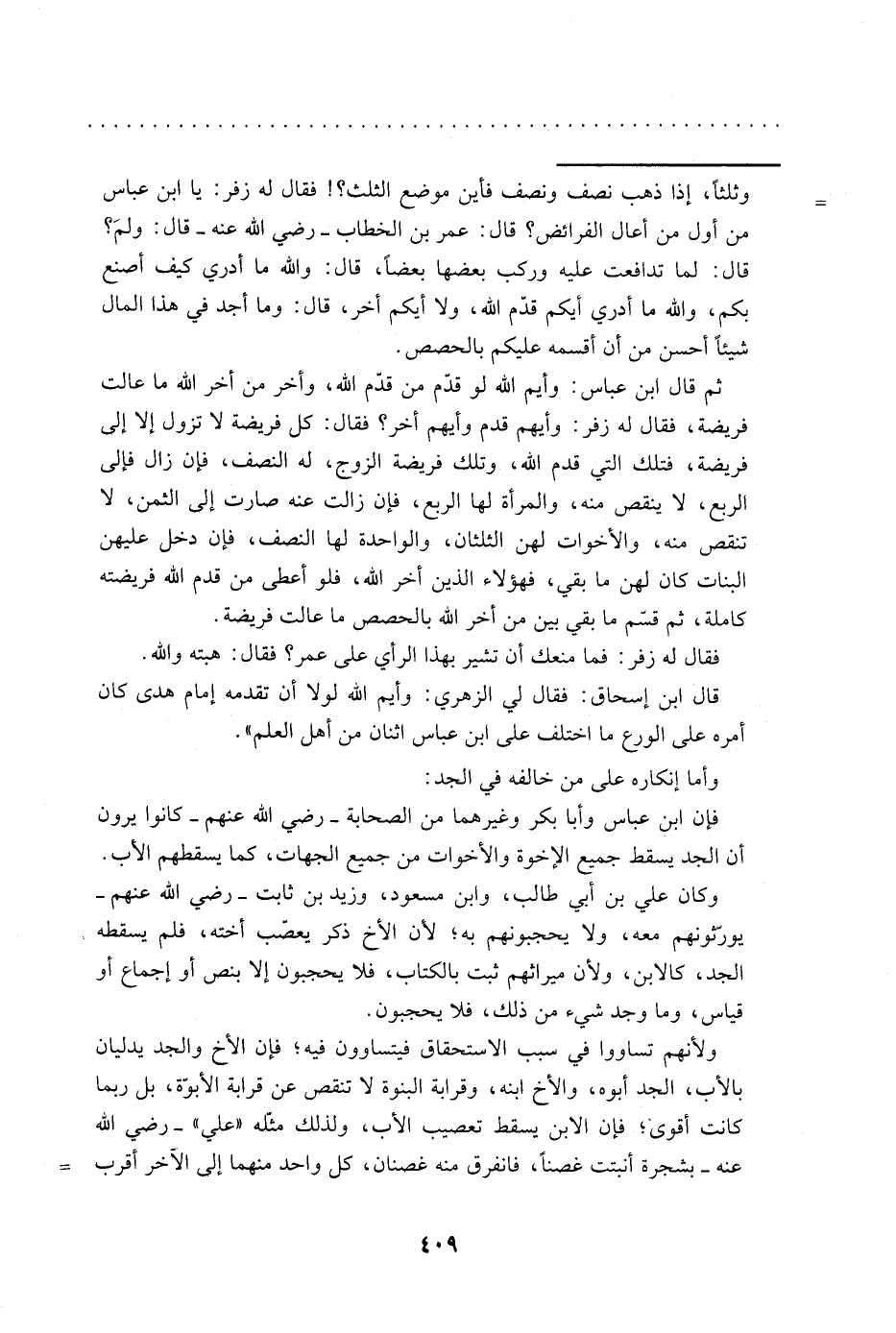 ثم قال: ابن عباس: وأيم الله لو قدم من قدم الله، وأخر من أخر الله ما عالت فريضة، فقال له زفر: وأيهم قدم وأيهم أخر؟ فقال: كل فريضة لا تزول إلا إلى فريضة، فتلك التي قدم الله، وتلك فريضة الزوج، له النصف، فإن زال فإلى الربع، لا ينقص منه، والمرأة لها الربع، فإن زالت عنه صارت إلى الثمن، لا تنقص منه، الأخوات لهن الثلثان، والواحدة لها النصف، فإن دخل عليهن البنات كان لهن ما بقي، فهؤلاء الذين أخر الله، فلو أعطى من قدم الله فريضته كاملة، ثم قسم ما بقي بين من أخر الله بالحصص ما عالت فريضة.