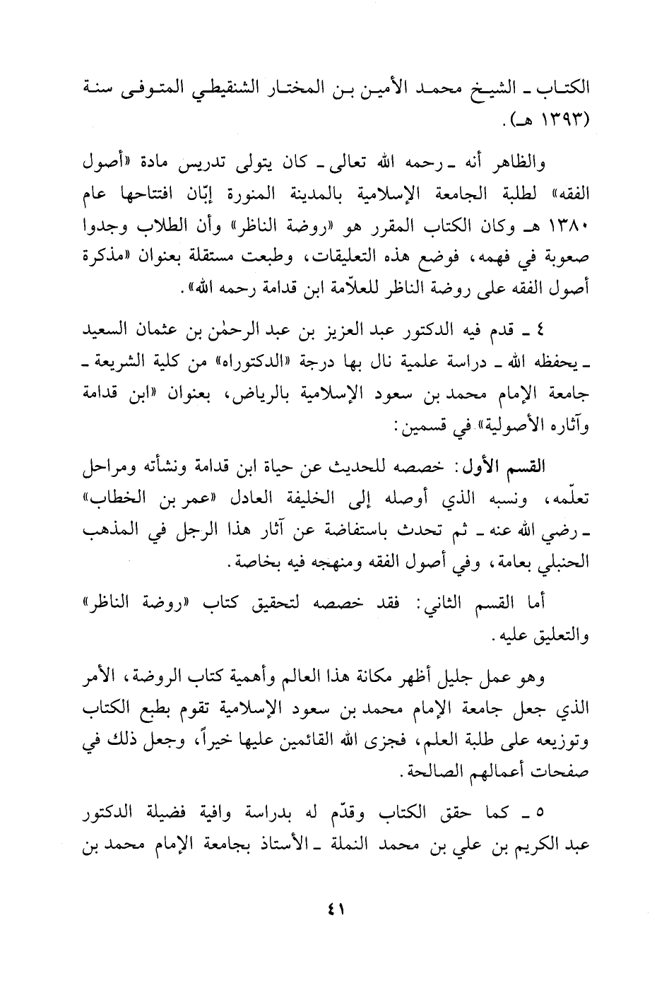 وهو عمل جليل أظهر مكانة هذا العالم وأهمية كتاب الروضة، الأمر الذي جعل جامعة الإمام محمد بن سعود الإسلامية تقوم بطبع الكتاب وتوزيعه على طلبة العلم، فجزى الله القائمين عليها خيرًا، وجعل ذلك في صفحات أعمالهم الصالحة.