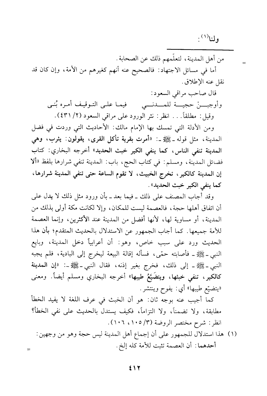وقد أجاب المصنف على ذلك -فيما بعد- بأن ورود مثل ذلك لا يدل على أن اتفاق أهلها حجة، فالعصمة ليست للمكان، وإلا لكانت مكة أولى بذلك من المدينة، ومساوية لها، لأنها أفضل من المدينة عند الأكثرين، وإنما العصمة للأمة جميعها. كما أجاب الجمهور عن الاستدلال بالحديث المتقدم؛ بأن هذا الحديث ورد على سبب خاص، وهو: أن أعرابيًا دخل المدينة، وبايع النبي -صلى الله عليه وسلم- إلى ذلك، فخرج بغير إذنه، فقال النبي -صلى الله عليه وسلم-: "إن المدينة كالكير، تنفي خبثها، ويتضيع طيبها" أخرجه البخاري ومسلم أيضًا. ومعنى "يتضيع طيبها" أي: يفوح وينتشر.