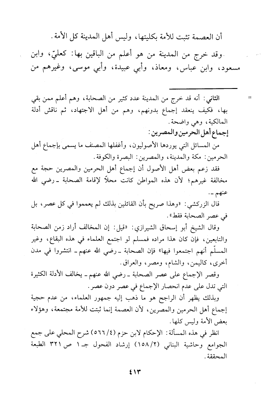 وبذلك يظهر أن الراجح هو ما ذهب إليه جمهور العلماء، من عدم حجية إجماع أهل الحرمين والمصرين، لأن العصمة إنما ثبتت مجتمعة، وهؤلاء بعض الأمة وليس كلها.