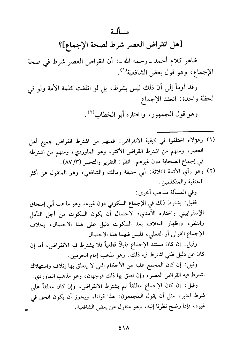 1 وهؤلاء اختلفوا في كيفية الانقراض: فمنهم من اشترط انقراض جميع أهل العصر، ومنهم من اشتراط انقراض الأكثر، وهو الماوردي، ومنهم من اشترطه في إجماع الصحابة دون غيرهم. انظر: التقرير والتحبير "3/ 87".