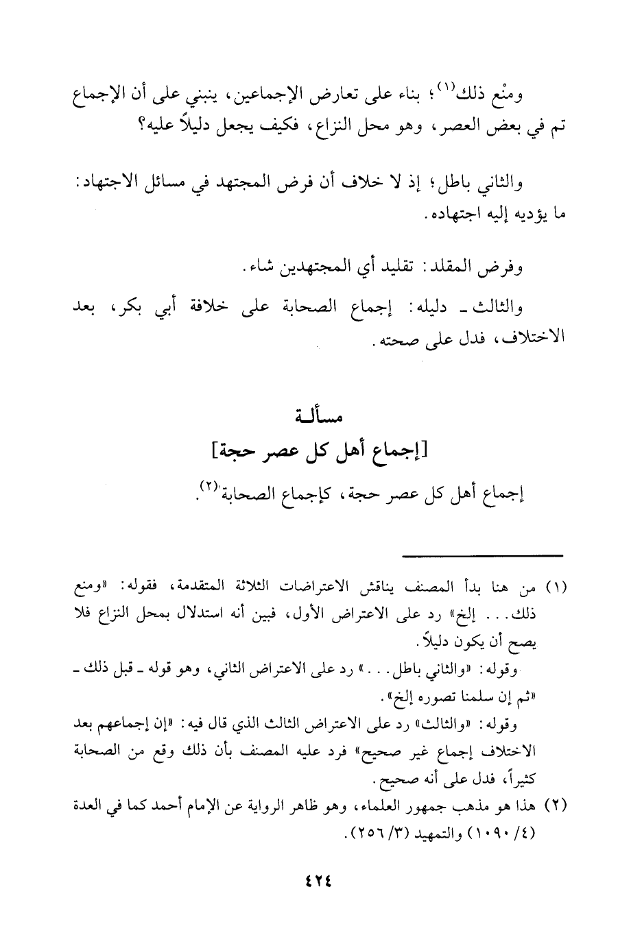 ومنْع ذلك1؛ بناء على تعارض الإجماعين ينبني على أن الإجماع تم في بعض العصر، وهو محل النزاع، فكيف يجعل دليلًا عليه؟
