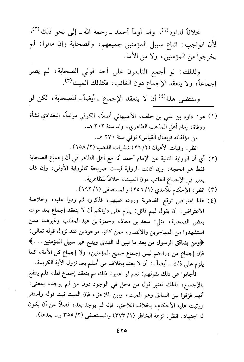 خلافًا لداود1، وقد أومأ أحمد -رحمه الله- إلى نحو ذلك2، لأن الواجب: اتباع سبيل المؤمنين جميعهم، والصحابة وإن ماتوا: لم يخرجوا من المؤمنين ولا من الأمة.