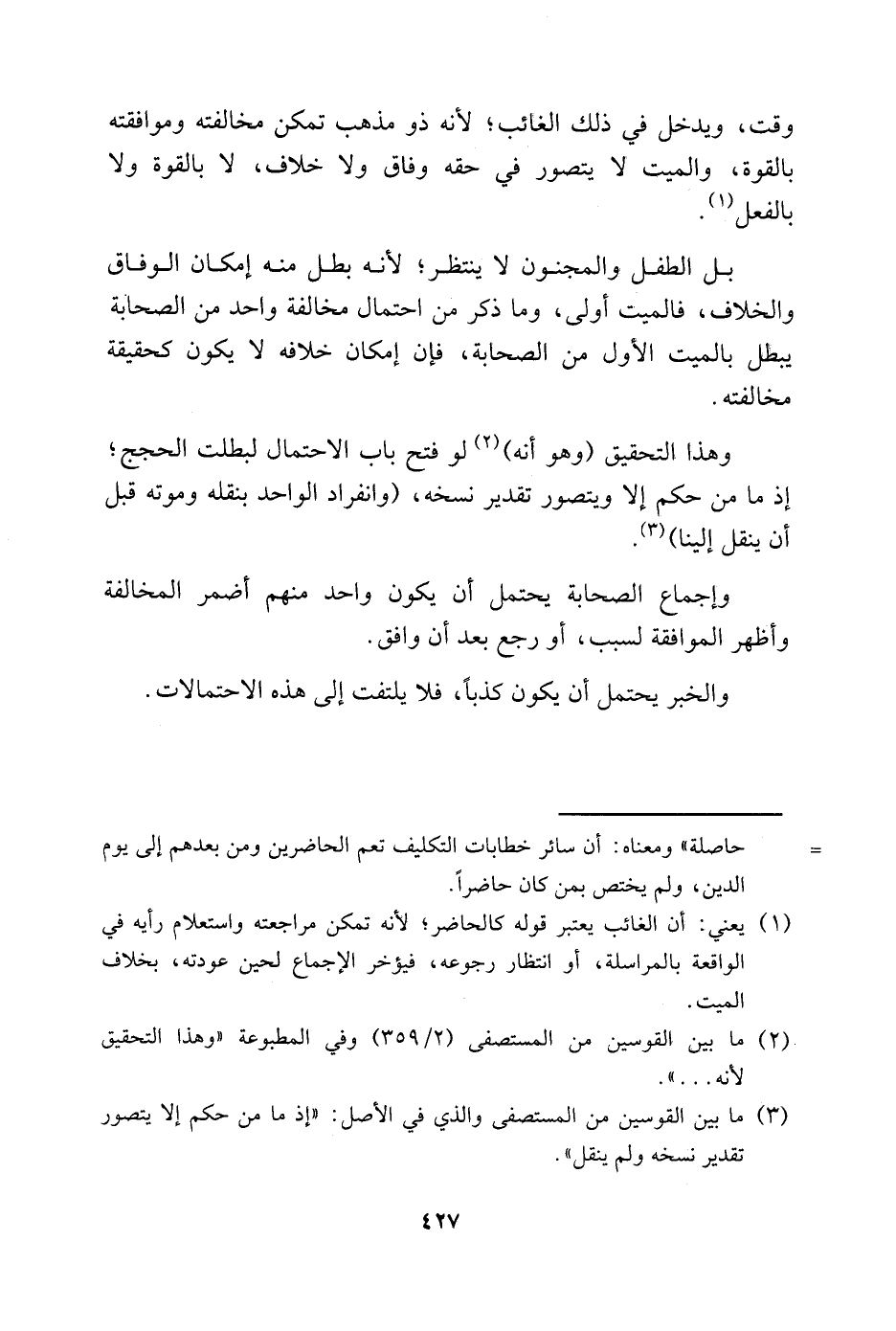 3 ما بين القوسين في المستصفى والذي في الأصل: "إذ ما من حكم إلا يتصور تقدير نسخه ولم ينقل".