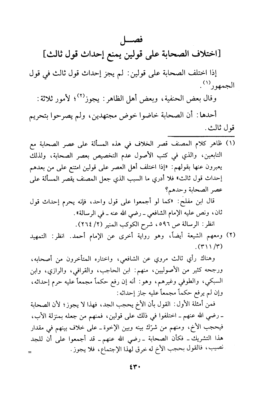 1 ظاهر كلام المصنف قصر الخلاف في هذه المسألة على عصر الصحابة مع التابعين، والذي في كتب الأصول عدم التخصيص بعصر الصحابة، ولذلك يعبرون عنها بقولهم: "إذا اختلف أهل العصر على قولين امتنع على من بعدهم إحداث قول ثالث" فلا أدري ما السبب الذي جعل المصنف يقصر المسألة على عصر الصحابة وحدهم؟