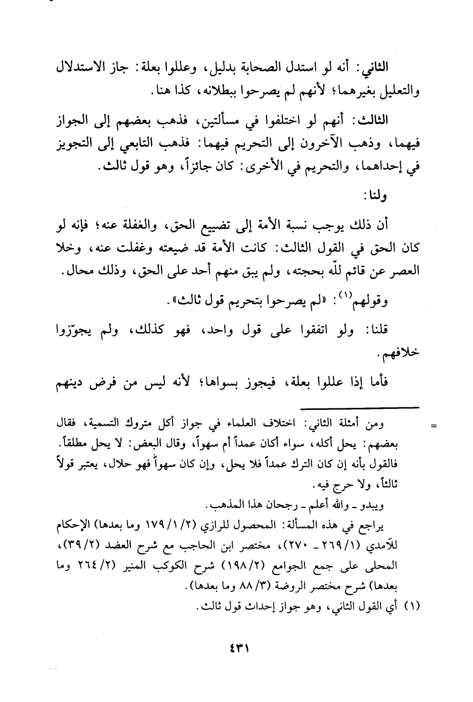 أن ذلك يوجب نسبة الأمة إلى تضييع الحق، والغفلة عنه؛ فإنه لو كان الحق في القول الثالث: كانت الأمة قد ضيعته وغفلت عنه، وخلا العصر من قائم لله بحجته، ولم يبق منهم عليه أحد وذلك محال. وقولهم1: "لم يصرحوا بتحريم قول ثالث".