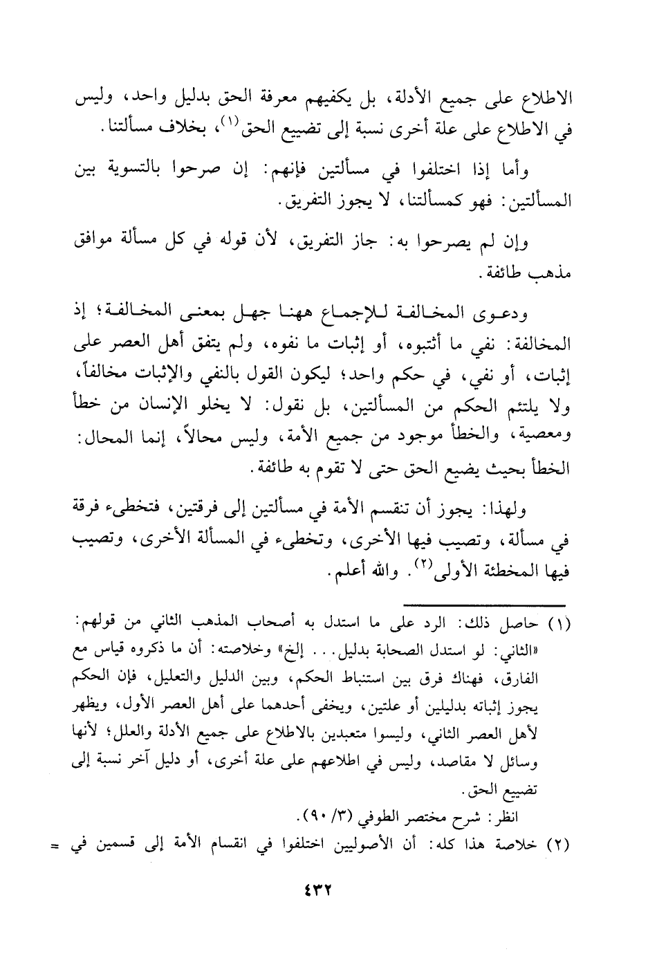 ودعوى المخالفة للإجماع ههنا جهل بمعنى المخالفة، إذ المخالفة: نفي ما أثبتوه، أو إثبات ما نفوه، ولم يتفق أهل العصر على إثبات أو نفي، في حكم واحد، ليكون القول بالنفي والإثبات مخالفًا، ولا يلتئم الحكم من المسألتين، بل نقول: لا يخلو الإنسان من خطأ ومعصية، والخطأ موجود من جميع الأمة، وليس محالًا، إنما المحال: الخطأ بحيث يضيع الحق حتى لا تقوم به طائفة.