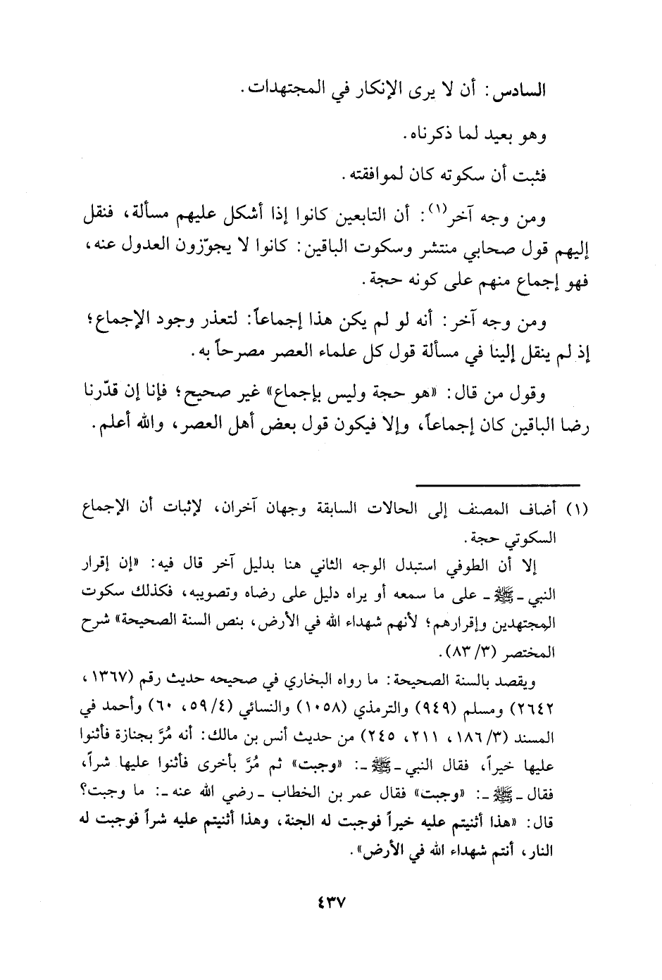 إلا ان الطوفي استبدل الوجه الثاني هنا بدليل آخر قال فيه: "إن إقرار النبي -صلى الله عليه وسلم- على ما سمعه أو يراه دليل على رضاه وتصويبه، فكذلك سكوت المجتهدين وإقرارهم؛ لأنهم شهداء الله في الأرض، بنص السنة الصحيحة" شرح المختصر "3/ 83".
