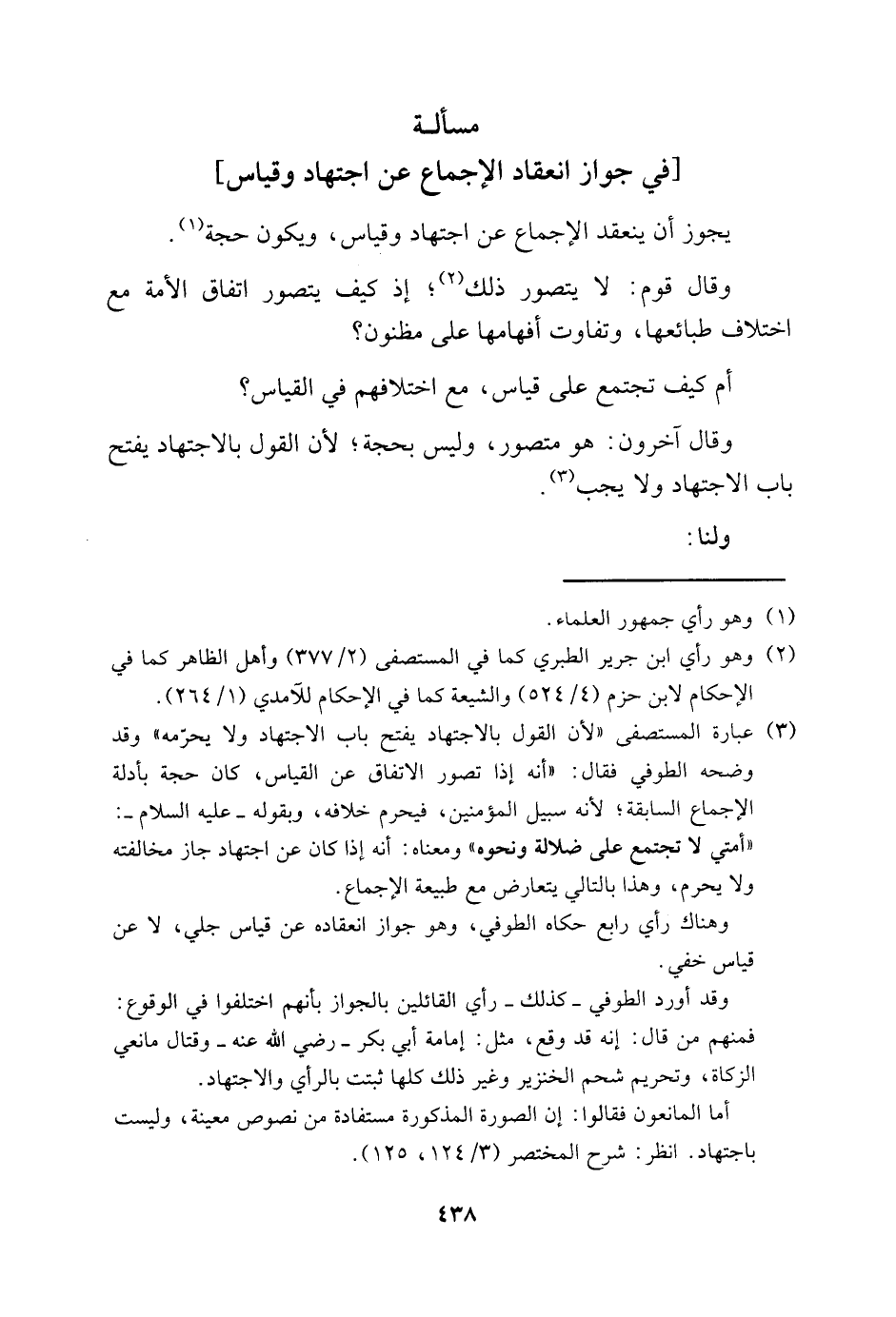 3 عبارة المستصفى "لأن القول بالاجتهاد يفتح باب الاجتهاد، ولا يحرمه" وقد وضحه الطوفي فقال: "إنه إذا تصور الاتفاق عن القياس، كان حجة بأدلة الإجماع السابقة؛ لأنه سبيل المؤمنين، فيحرم خلافه، وبقوله -عليه السلام-: "أمتى لا تجمتع على ضلالة ونحوه" ومعناه: انه إذا كان عن اجتهاد جاز مخالفته ولا يحرم، وهذا بالتالي يتعارض مع طبيعة الإجماع.